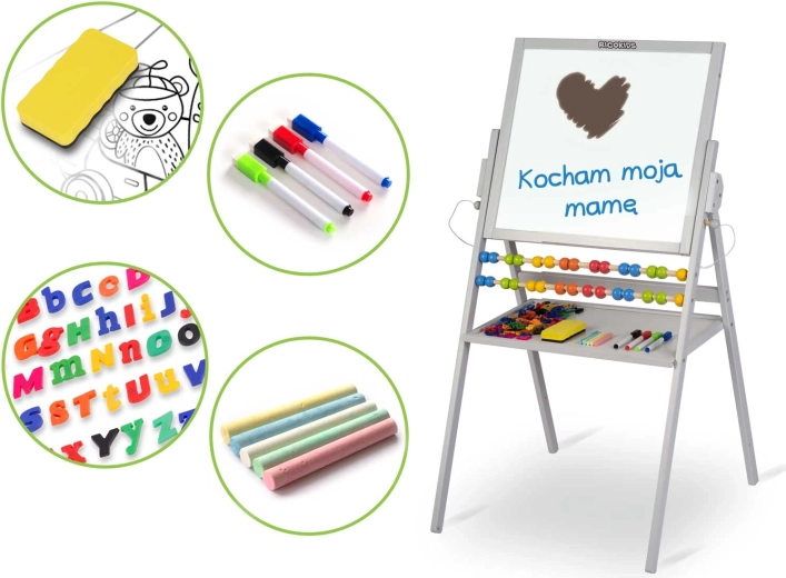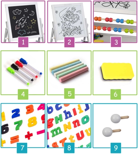 Díky bohatému příslušenství děti hned začnou tvořit: barevné křídy, stíratelné fixy, houbička, magnetická písmenka a číslice i montážní prvky. Bezpečné materiály a stabilní konstrukce z přírodního dřeva přinášejí klidný pocit rodičům a radost dětem.