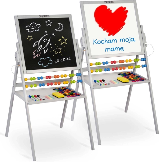 Magnetická bílá strana pro popisovače a práci s magnetky, křídová černá strana pro kreslení křídou – vše v jedné stabilní konstrukci.