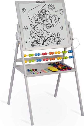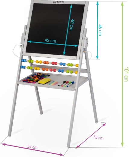 Oboustranná tabule RICOKIDS je ideální pomůcka pro kreativní učení doma i ve školce. Jedna strana je magnetická pro práci s magnetkami a popisovači, druhá je křídová pro klasické kreslení. Součástí je i počítadlo, které hravou formou podporuje první krůčky v matematice.