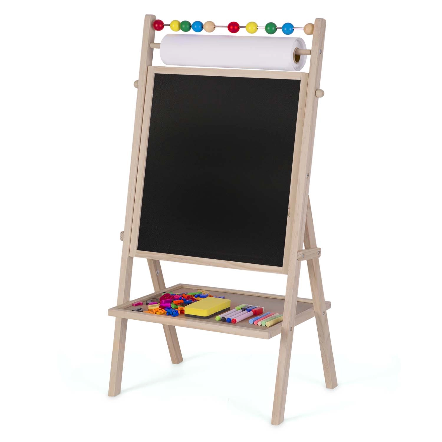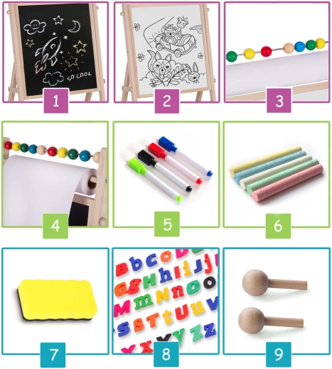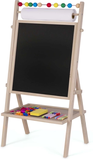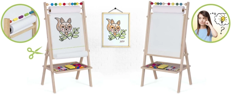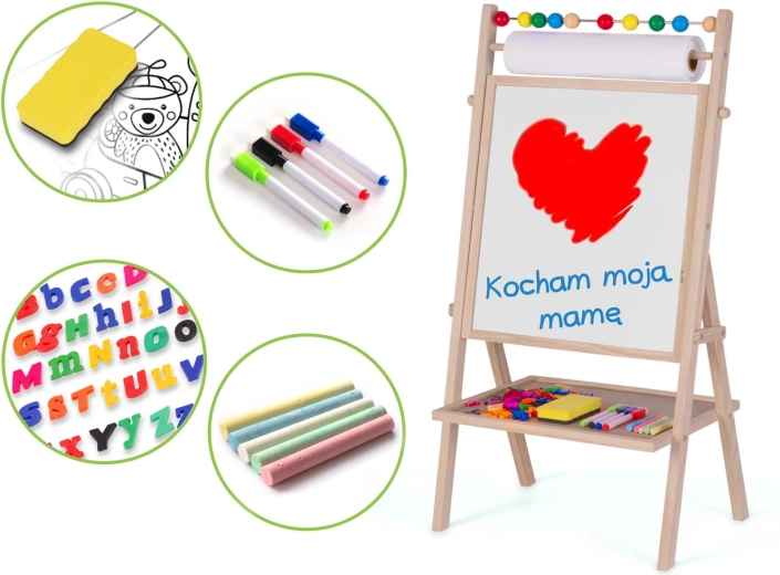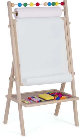 Objevte kreativní centrum pro malé umělce i školáky: stabilní, dřevěná tabule RICOKIDS kombinuje magnetickou bílou plochu a křídovou tabuli v jednom, doplněnou o 20m papírovou roli, počítadlo a bohatou sadu příslušenství pro učení a zábavu.