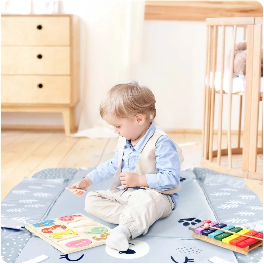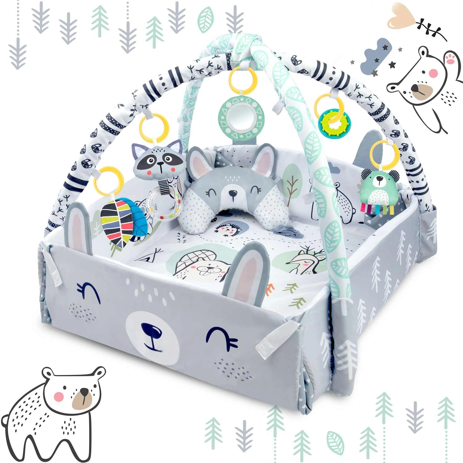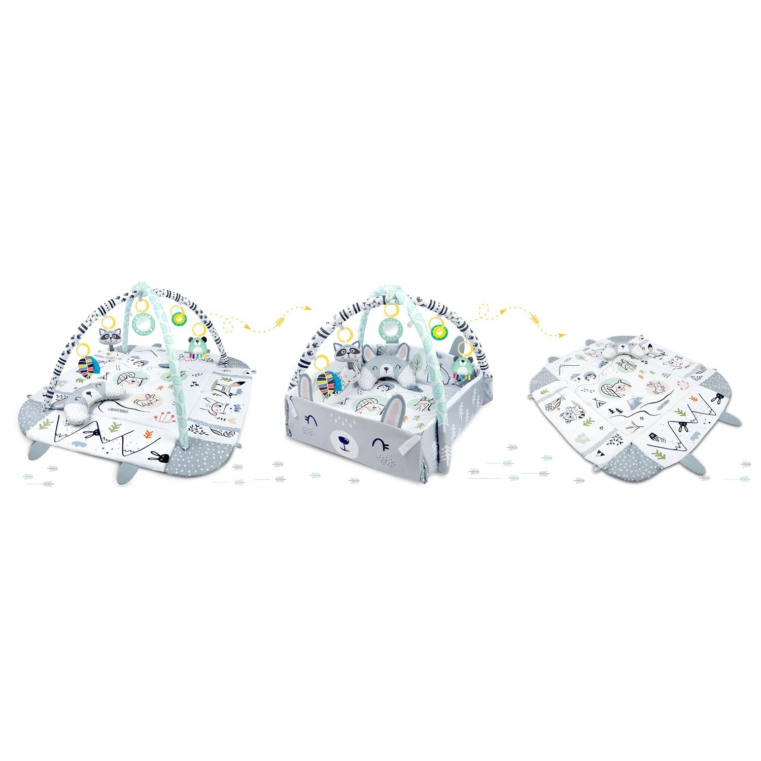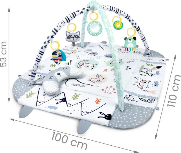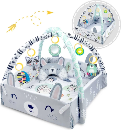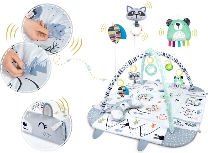 Součástí je 7 originálních hraček včetně zrcátka, chrastítek, šusticích prvků a pískací hračky s sensorickými stužkami. Hračky i polstrované oblouky lze jednoduše přemístit či odejmout. Polštářek pro tummy time s hebkou minky stranou podporuje správné polohování a posilování krčních a zádových svalů.