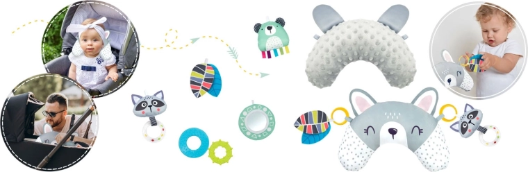 Součástí je podpůrný polštářek s hebkou minky stranou pro pohodlné posilování krčních a zádových svalů. Uši šustí a motivují k objevování.