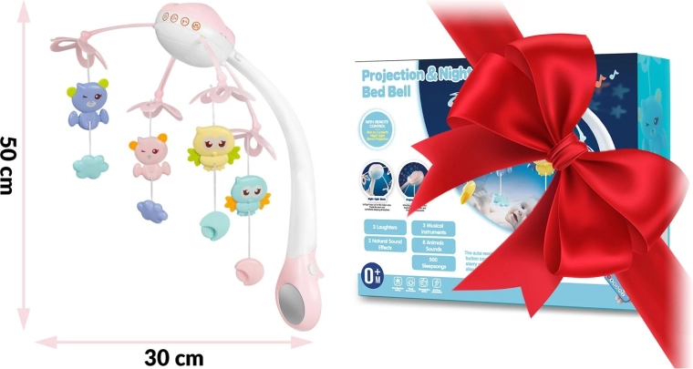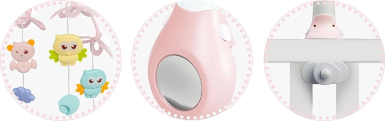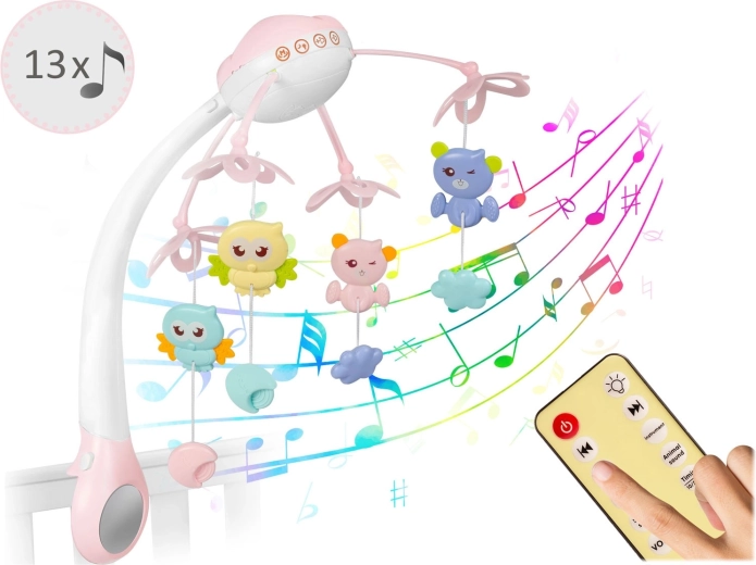 Uklidněte miminko jemným pohybem, světlem a hudbou. Tato růžová kolotoč nad postýlku kombinuje otočné závěsné hračky, noční světlo s projektorem hvězdiček a dálkové ovládání pro maximální pohodlí rodičů. Nabízí 13 melodií, časovač 10/20/30 min a bezpečné, stabilní uchycení na většinu dětských postýlek.