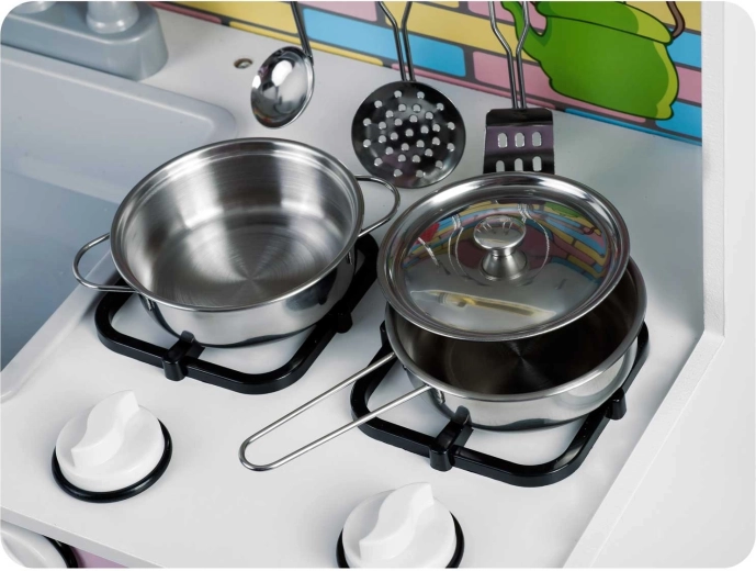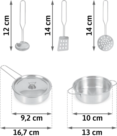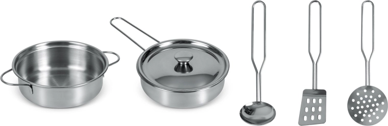 Obsah balení: malý hrnec s uchy, rendlík s poklicí a dlouhým držadlem, naběračka, děrovaná obracečka a děrovaná lžíce/cedník. Kovové příslušenství je odolné, snadno se udržuje a perfektně se hodí k dětským kuchyňkám, včetně modelů značky RICOKIDS.