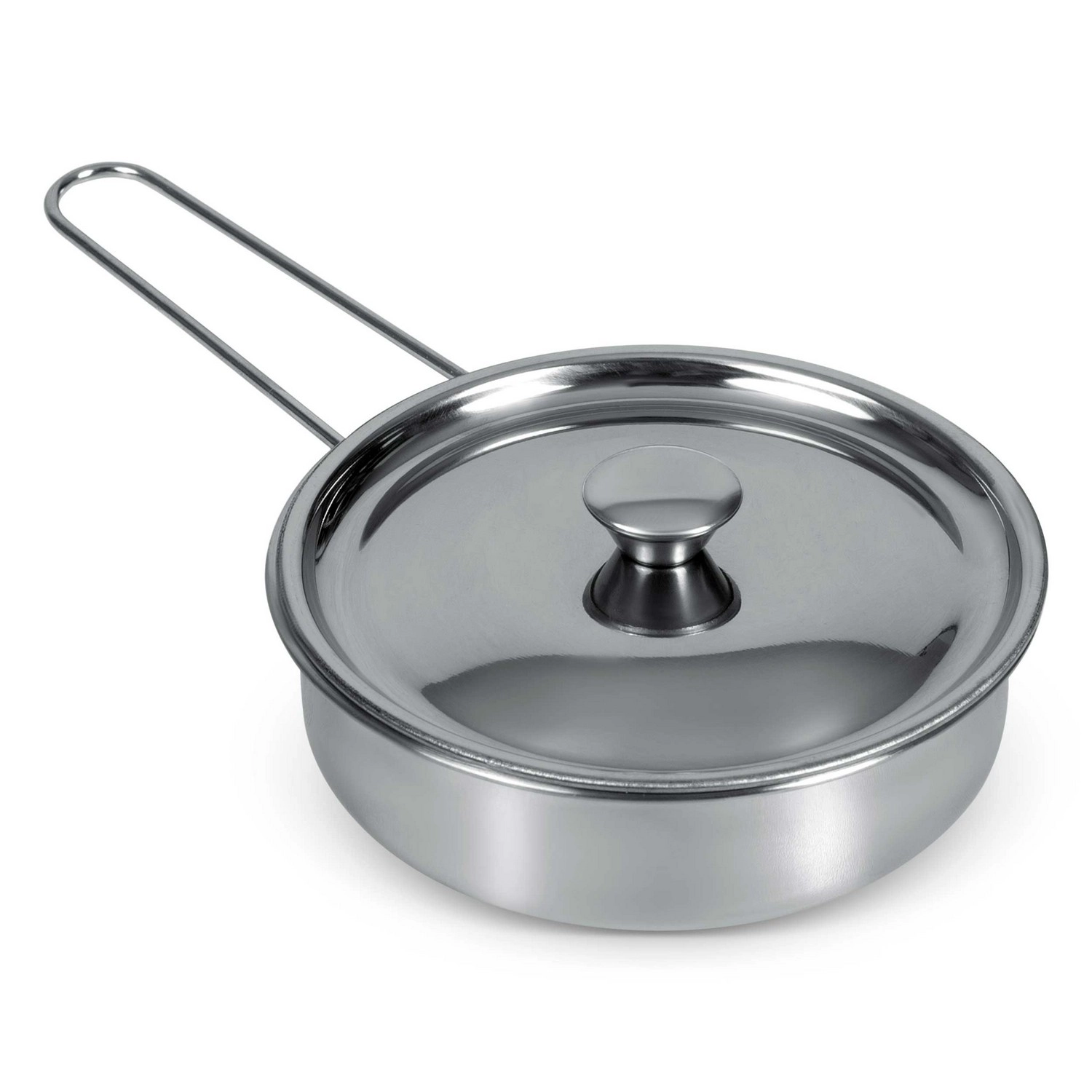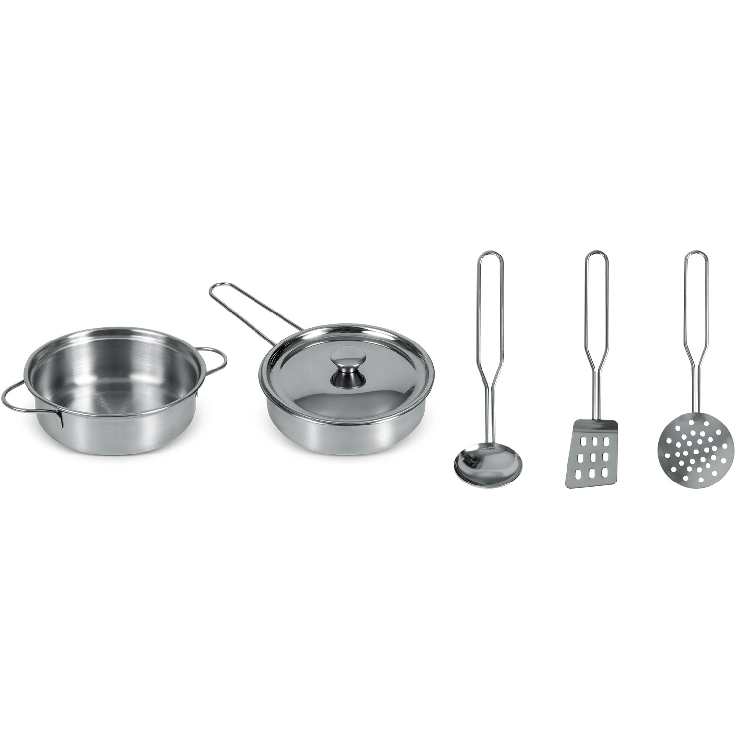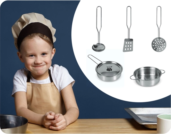 Hrnec, rendlík s poklicí a tři užitečné nástroje v dětské velikosti – vše z odolné nerezové oceli s lesklým povrchem pro autentickou hru na vaření.
