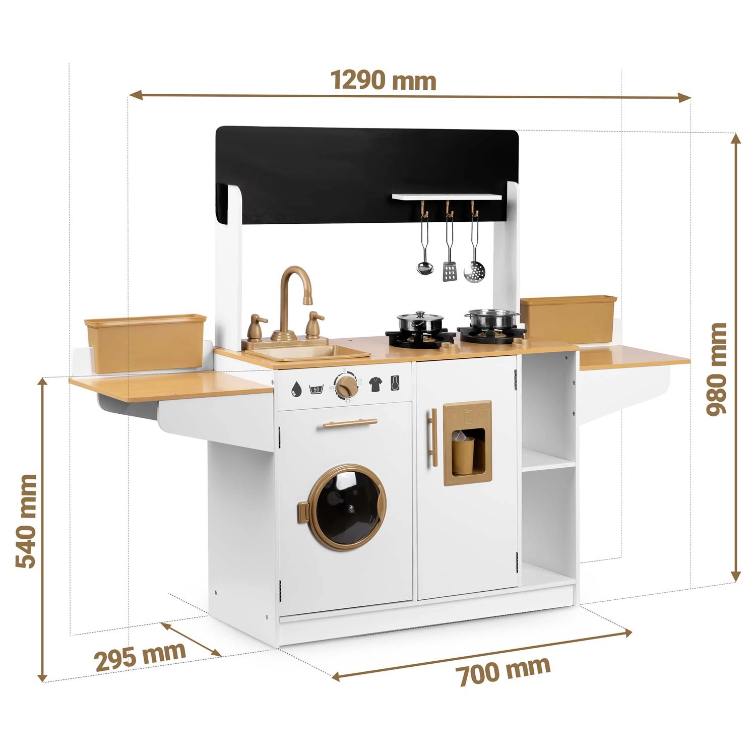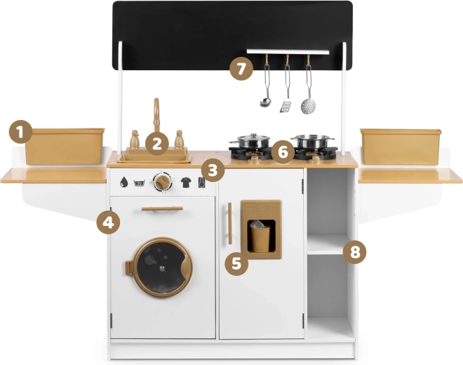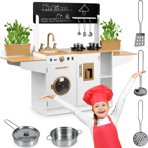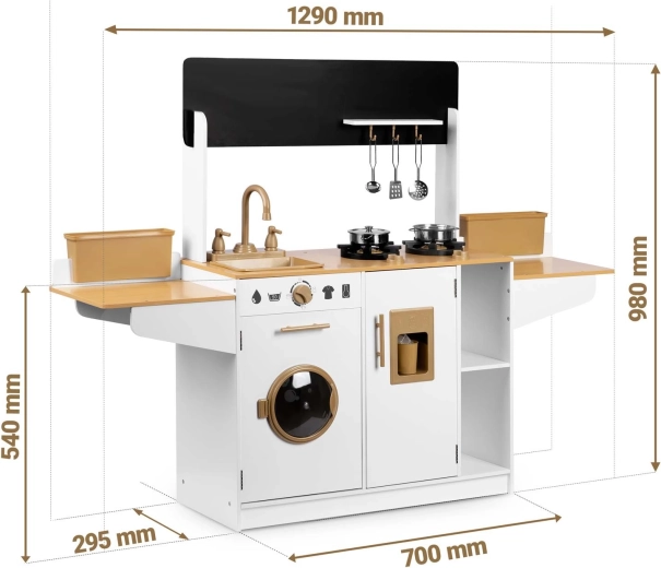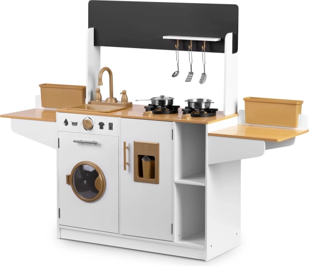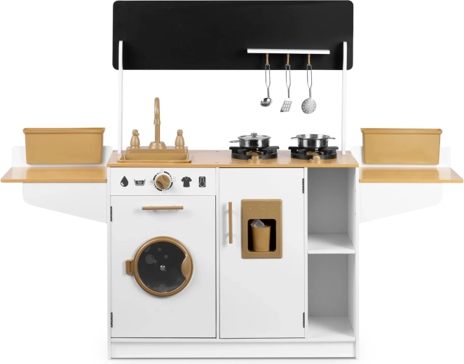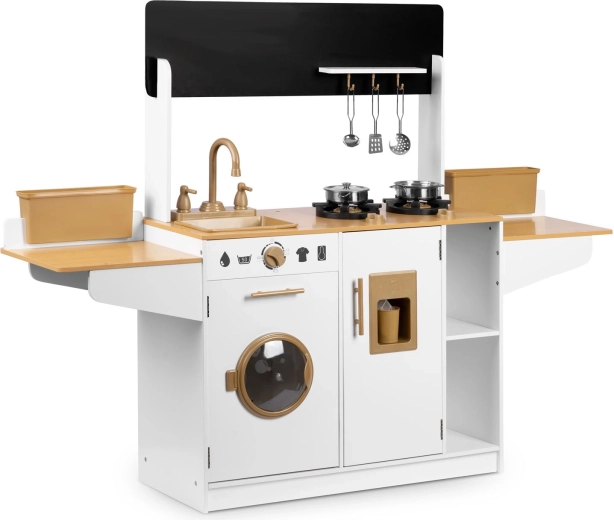 Dřevěná kuchyňka pro děti RICOKIDS přináší realistické detaily, které nadchnou malé kuchaře i kuchařky: funkční knoflíky, dřez s kohoutky, otevírací dvířka i „spotřebiče“, jako je pračka či lednice s výrobníkem ledu. Součástí je také sada kovového nádobí a závěsné kuchyňské náčiní.