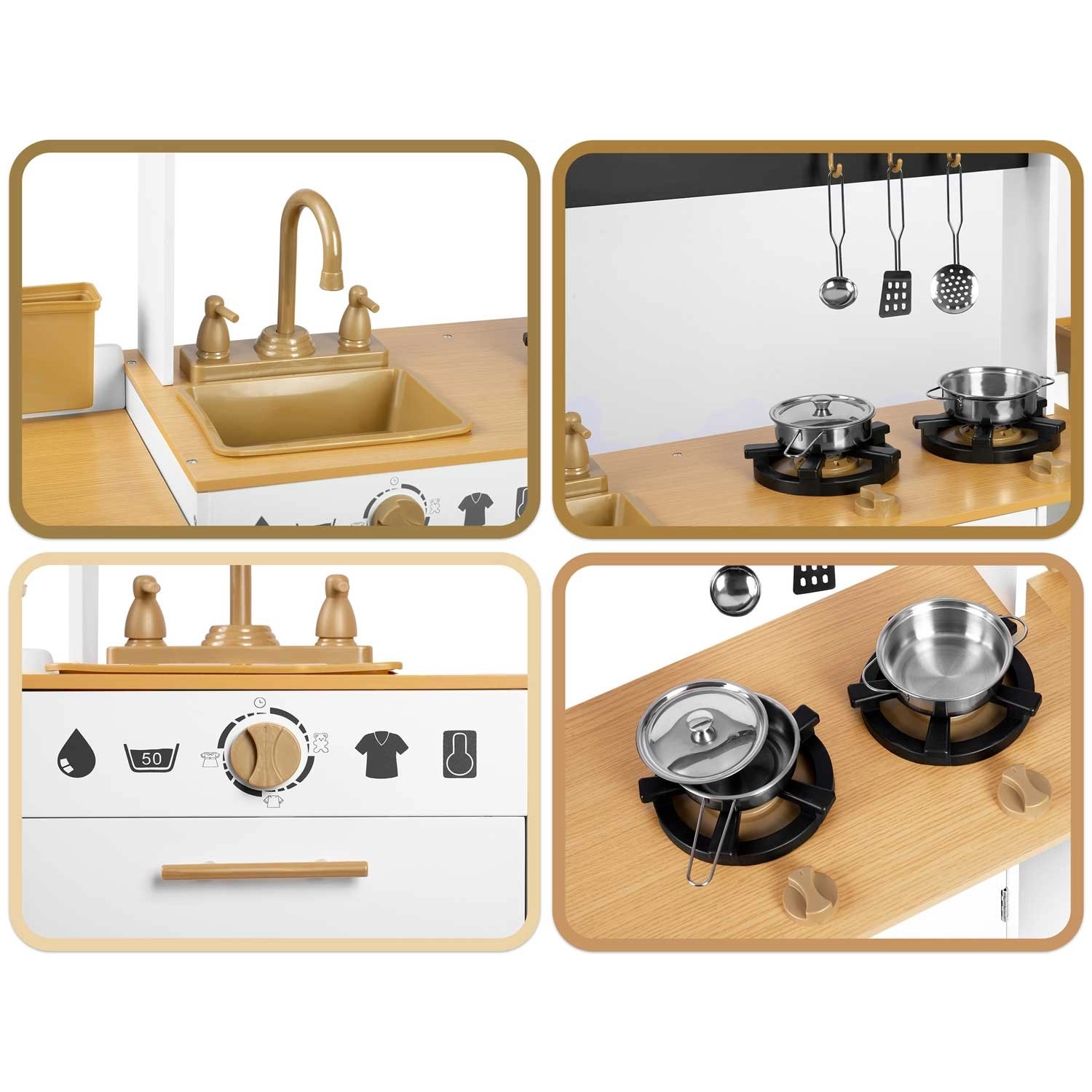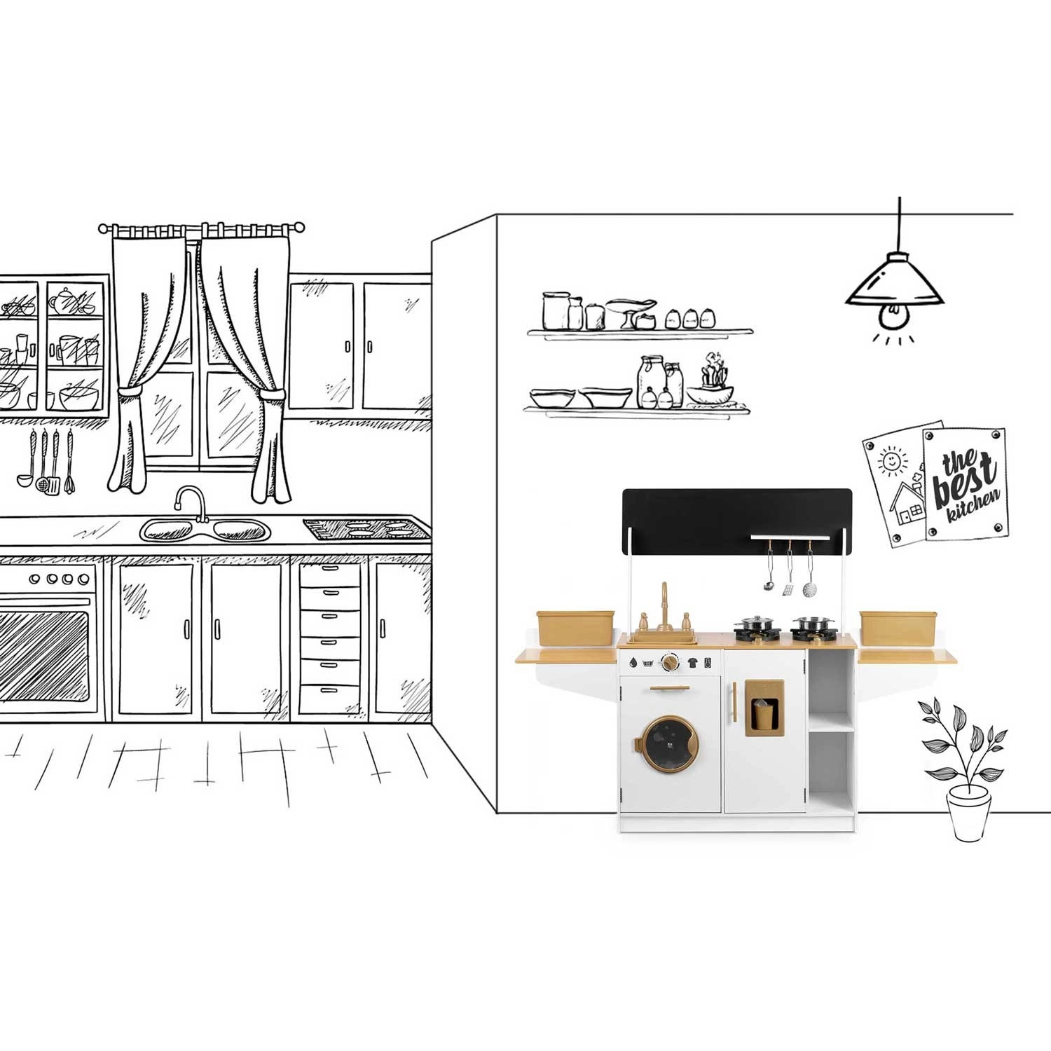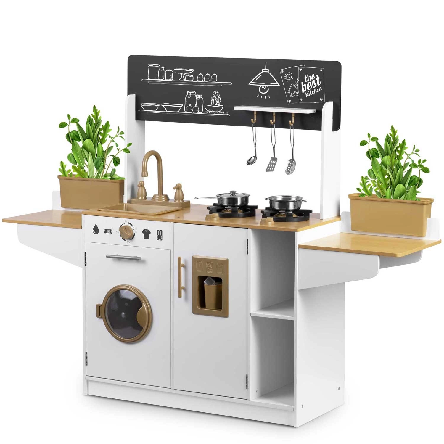 Dřevěná kuchyňka pro děti RICOKIDS přináší realistické detaily, které nadchnou malé kuchaře i kuchařky: funkční knoflíky, dřez s kohoutky, otevírací dvířka i „spotřebiče“, jako je pračka či lednice s výrobníkem ledu. Součástí je také sada kovového nádobí a závěsné kuchyňské náčiní.