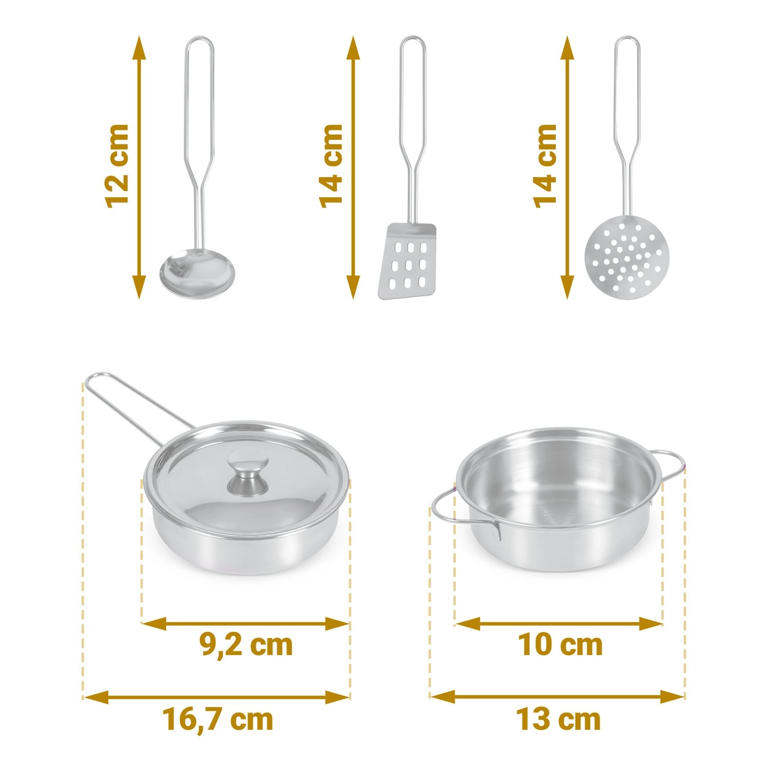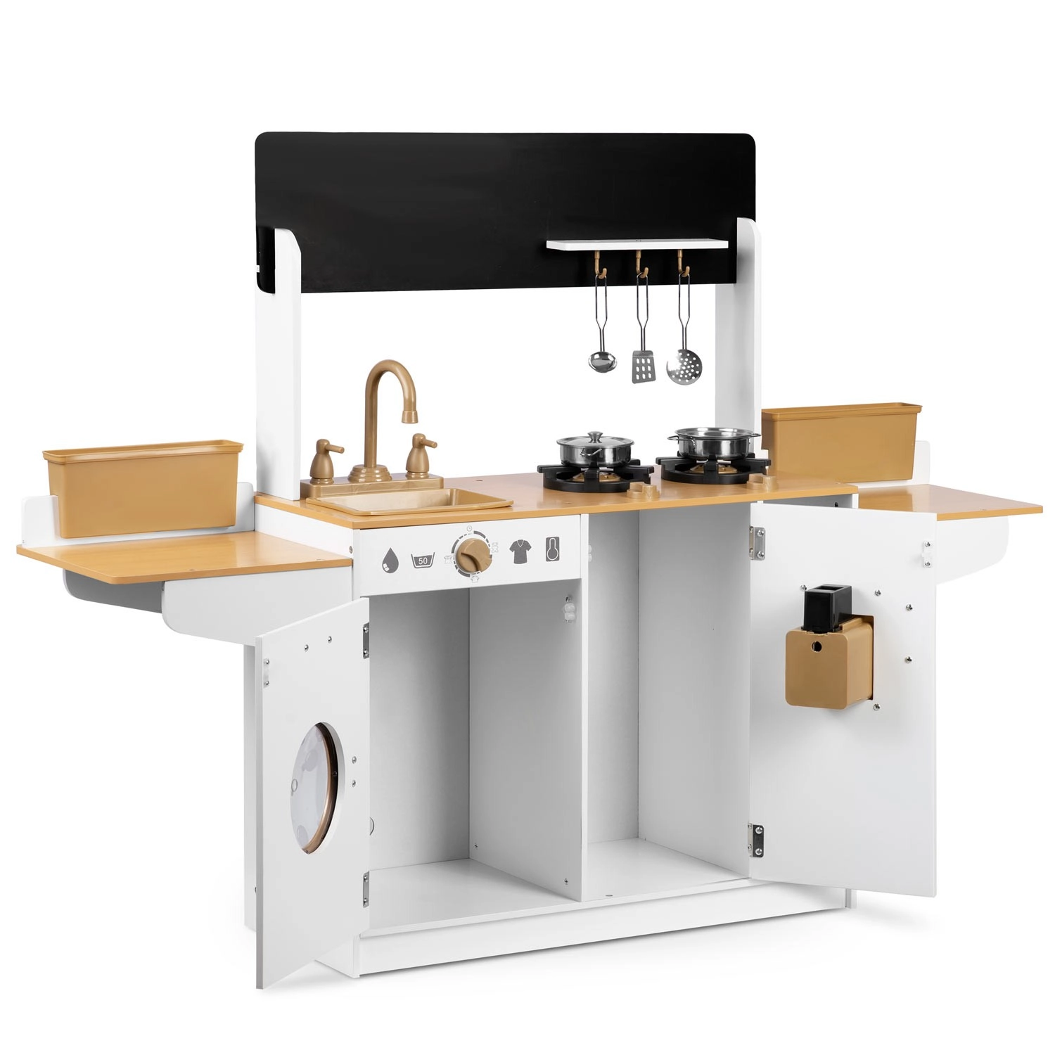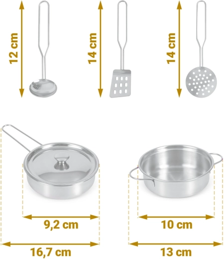 Dvě plotýnky se zvukem otáčení knoflíků, věšáky na náčiní a kovové hrnce podněcují představivost a přibližují dětem skutečné vaření.