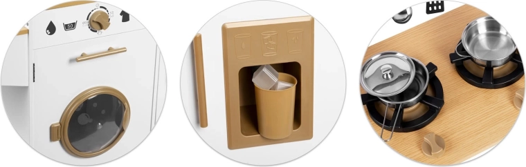 - Realistické prvky: sporák se dvěma plotýnkami, otočné knoflíky, dřez s kohoutky, pračka s čirými dvířky, výrobník ledu a chladnička s mrazákem.
