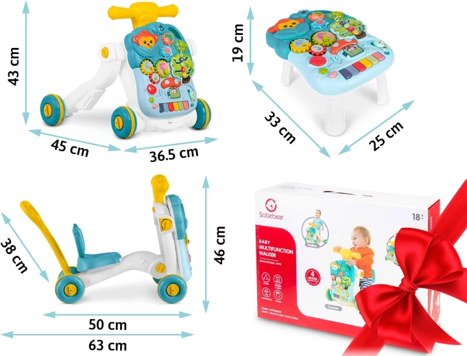 Jednoduchým přestavěním přizpůsobíte hračku aktuálním potřebám dítěte – od prvních krůčků až po samostatnou jízdu a stolní hraní.