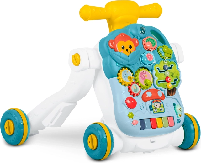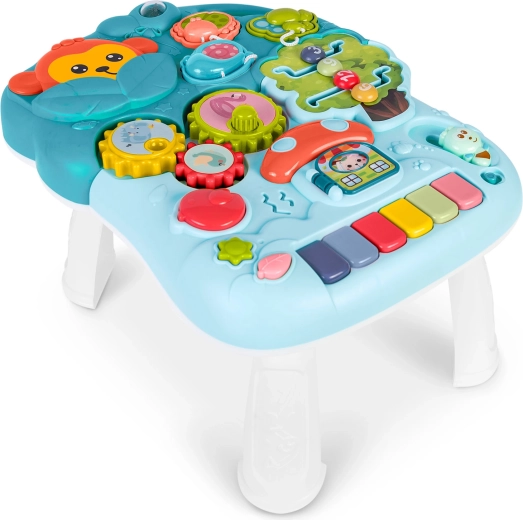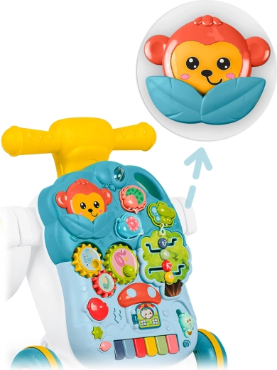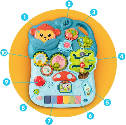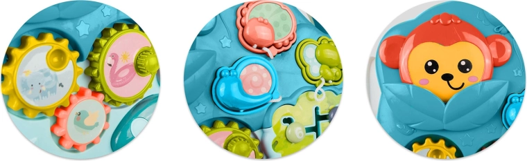 Odnímatelný panel je nabitý aktivitami: barevné pianinko, kolíčky, zubatá kolečka, tlačítka s písničkami a perkusními zvuky, labyrint s drátky, tvarové párování, ruchové prvky a další. Dítě tak zábavnou formou poznává barvy, tvary a čísla a rozvíjí jemnou motoriku i koordinaci oko–ruka.