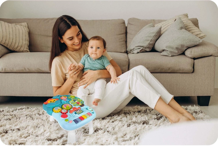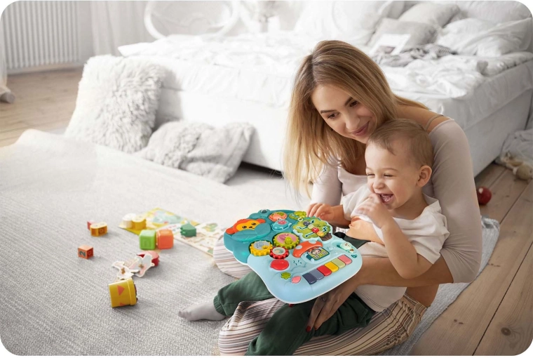 Tlačítka, zubatky, posuvníky, labyrint a barevné klávesy podporují učení barev, tvarů i čísel a rozvíjejí jemnou motoriku a smysly.