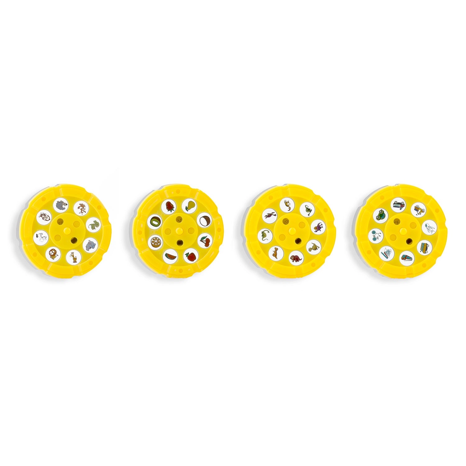 Čtyři žluté disky nabízejí tematické motivy (dinosauři, vozidla, ovoce a zelenina, zvířata). Děti si snadno vyberou a promítnou předlohu k obkreslení a vybarvení.