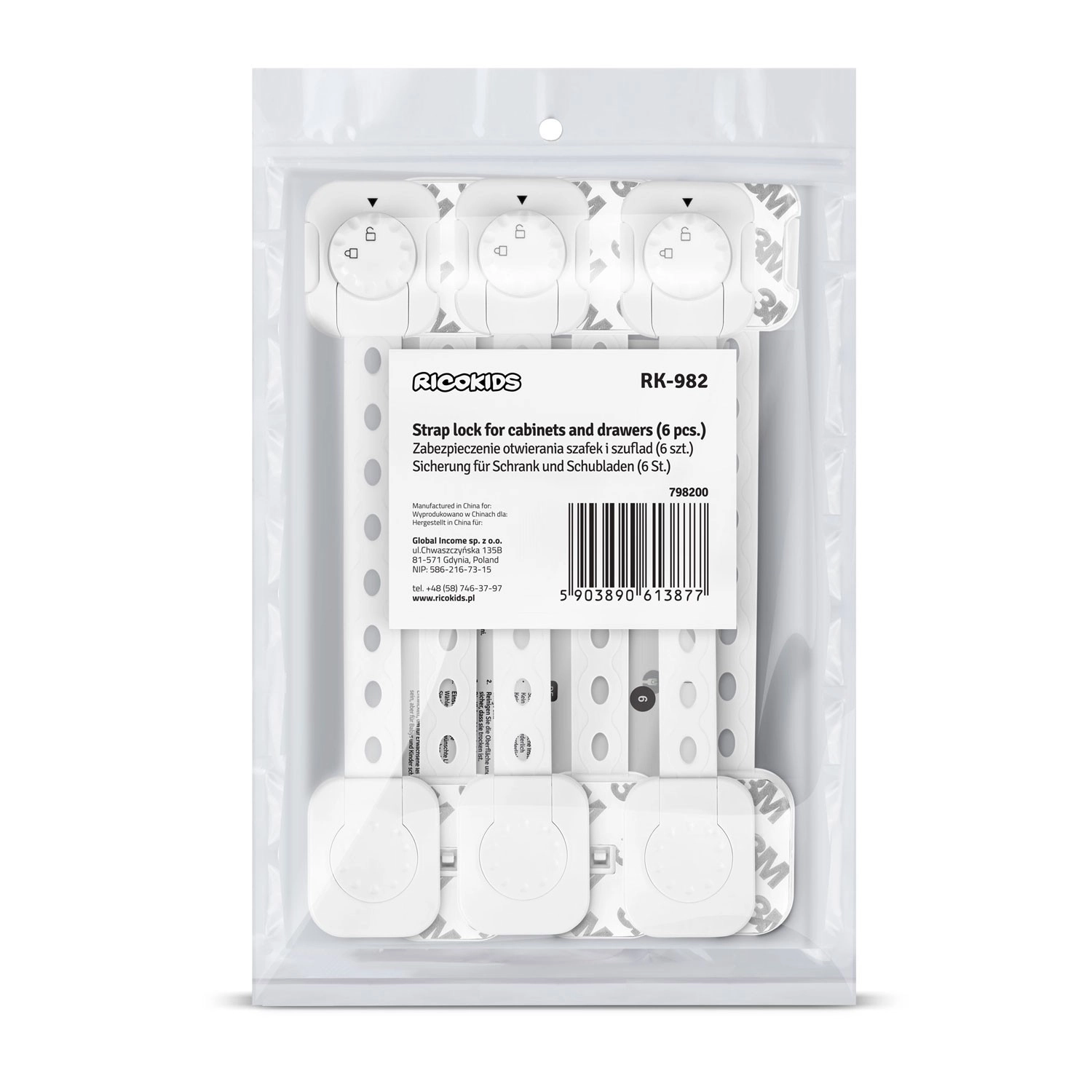 Bezpečnostní zámky RICOKIDS pomáhají udržet děti v bezpečí a váš nábytek v pořádku. Diskrétní bílé provedení a čistý design ladí s většinou interiérů, zatímco odolné plastové tělo s flexibilním páskem spolehlivě brání nechtěnému otevření skříněk, zásuvek, lednice či WC víka. Oceníte rychlou instalaci bez vrtání a možnost jednoduchého sejmutí bez poškození povrchů.