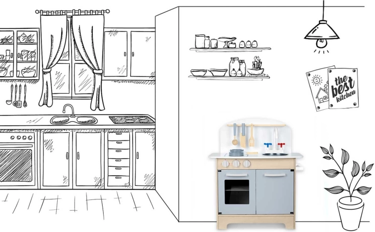 Dvě plotýnky s otočnými knoflíky a trouba s okénkem vtáhnou děti do hry na opravdové vaření a pečení – od "sušenek" z plastelíny po fantazijní menu.