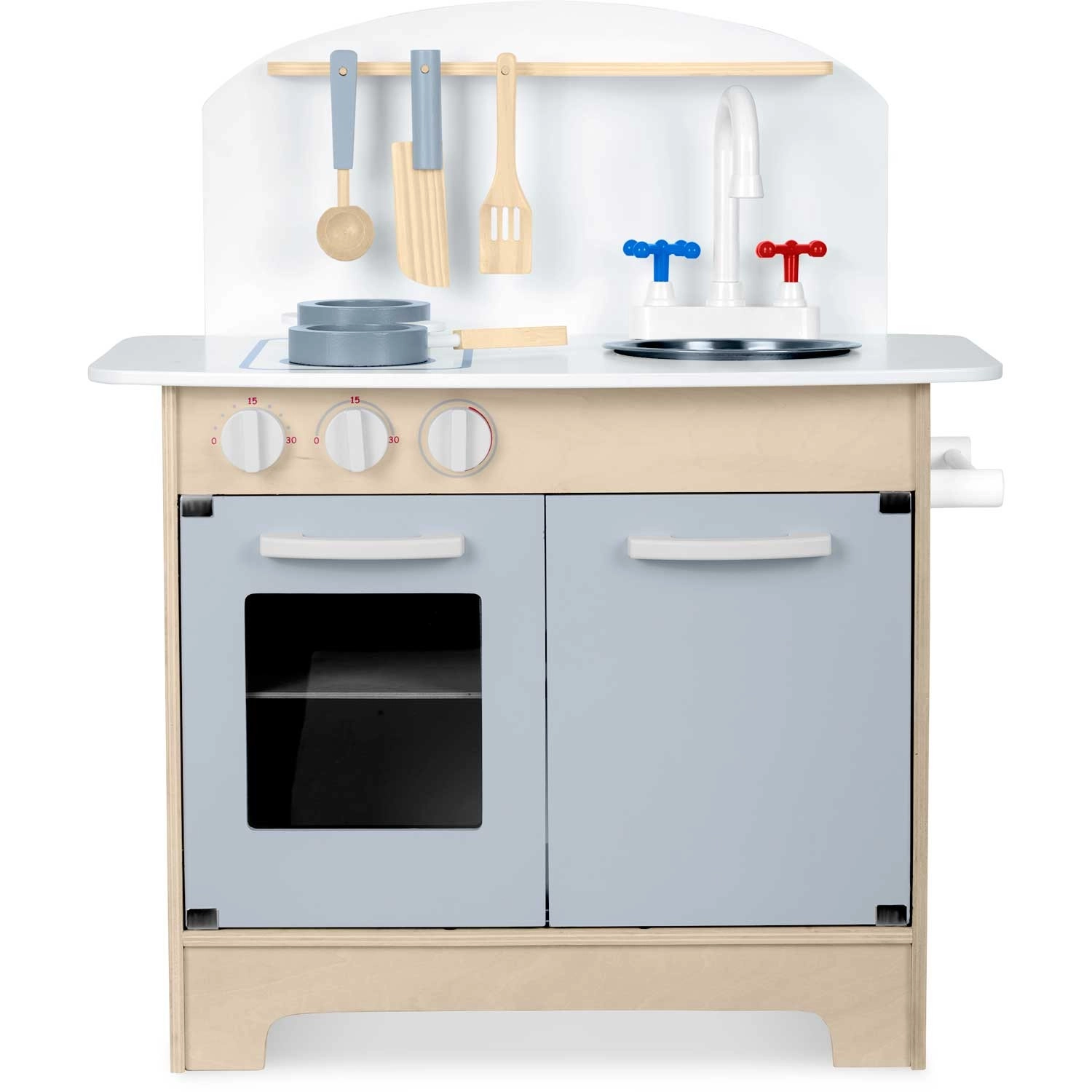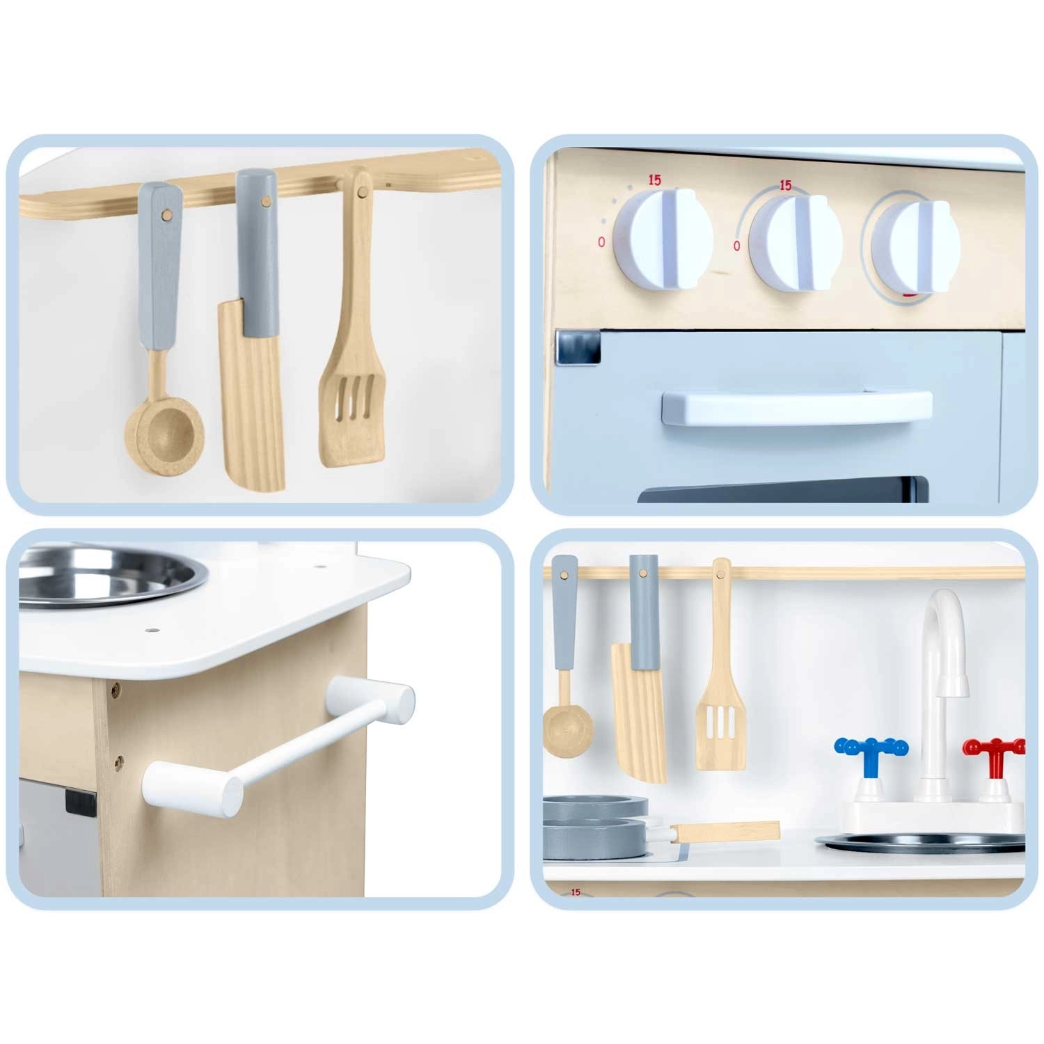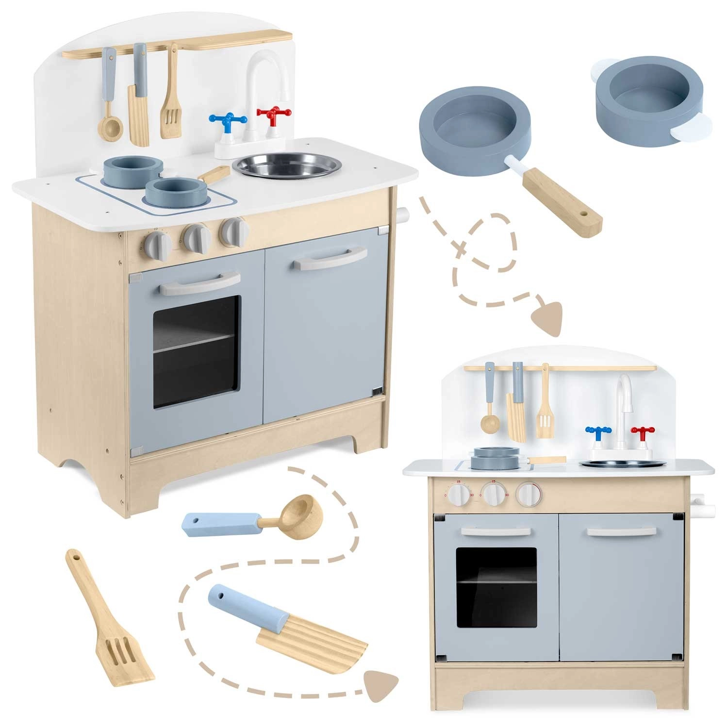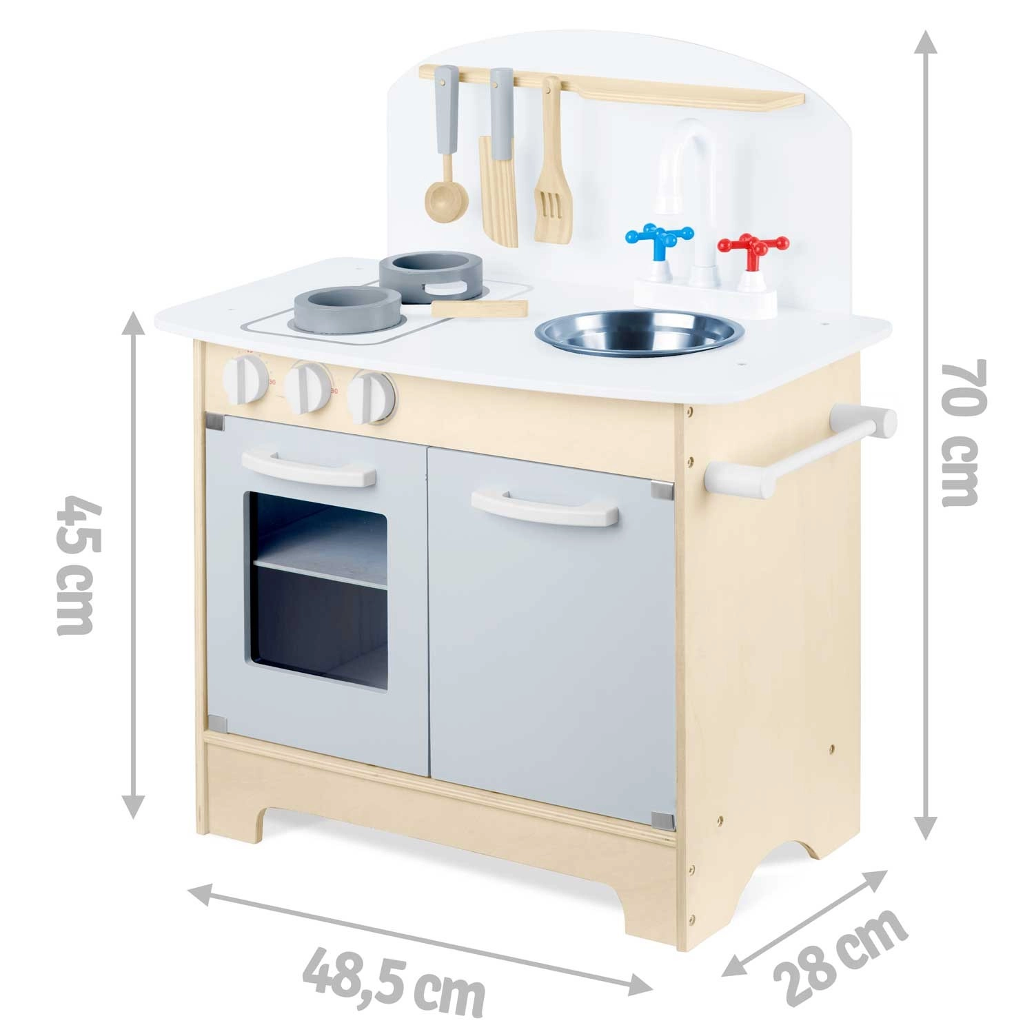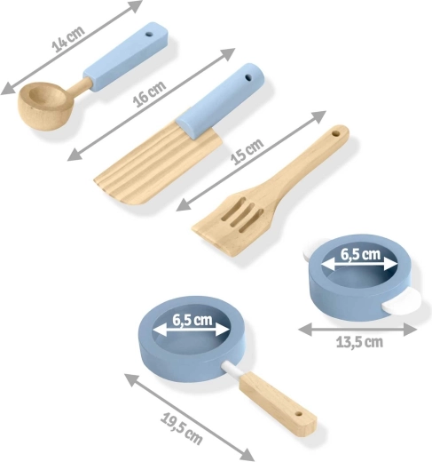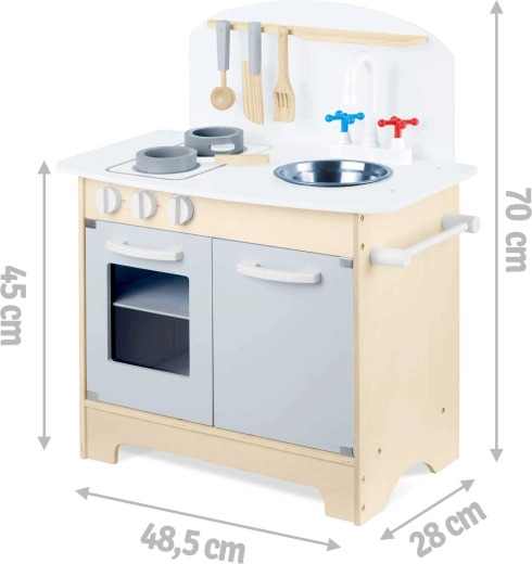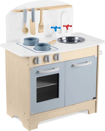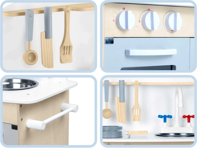 Promyšlené úložné prostory jako skříňka na nádobí, police a háčky na náčiní či držák na papírové utěrky udrží pořádek při vaření. Součástí je sada příslušenství: hrnec, pánev, lžíce, špachtle a nůž. Odolná dřevěná konstrukce v minimalistickém retro stylu se stane elegantní dekorací dětského pokoje.