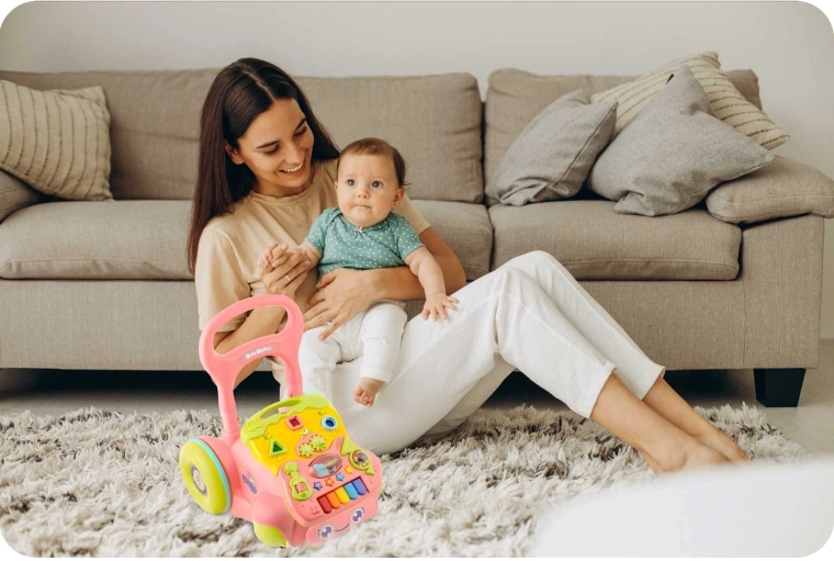 Stabilní pchací vozík podporuje první krůčky, zatímco odnímatelný panel nabízí světla, zvuky a hry na rozvoj motoriky a smyslů – doma i na cestách.