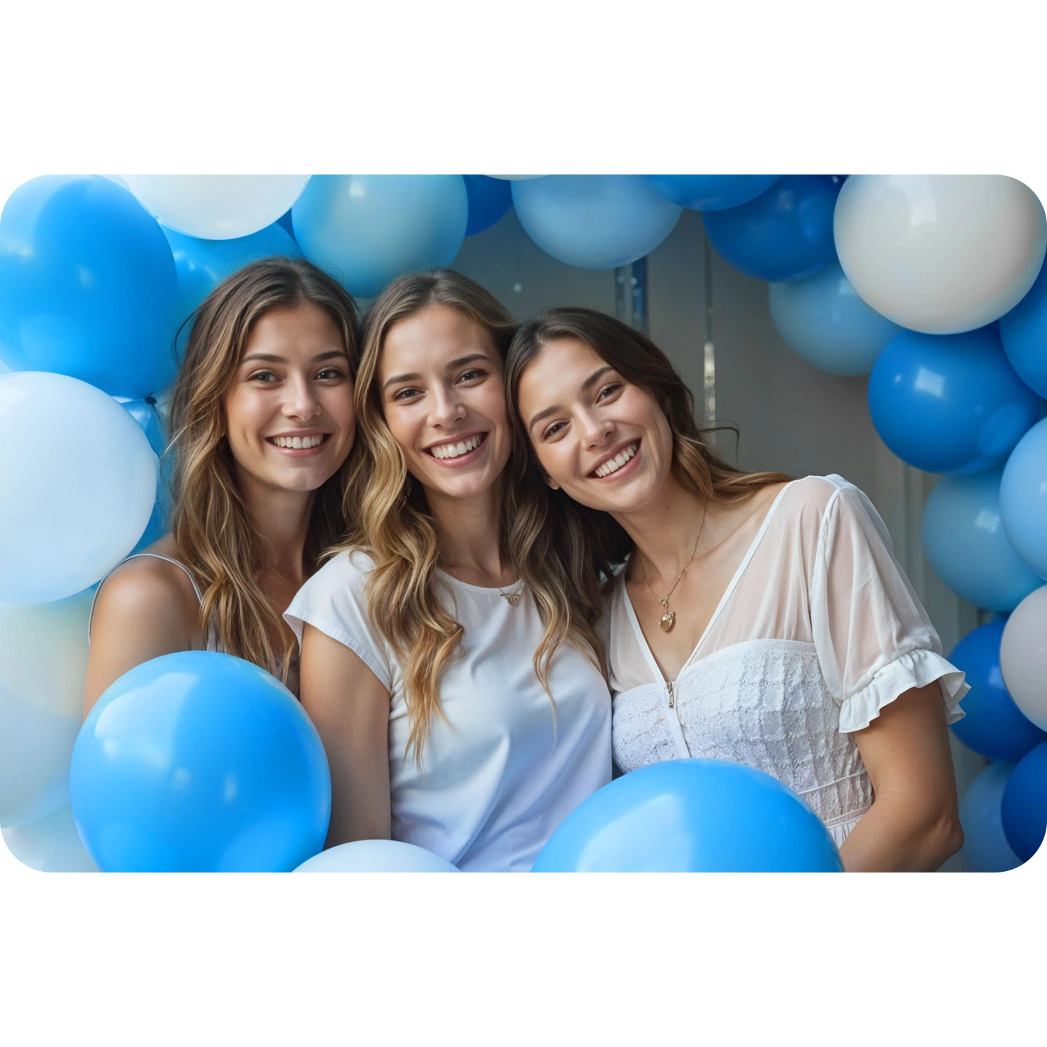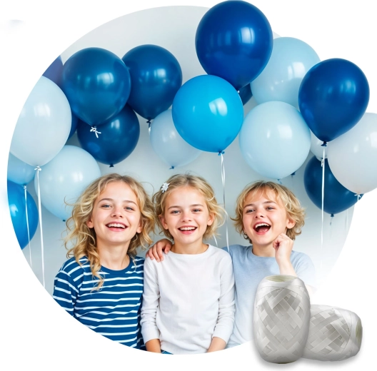 V balení najdete vše, co potřebujete: 30 latexových balonků v bílé, světle a tmavě modré barvě a 40 metrů stříbrné dekorační stuhy pro uvázání nebo tvorbu girland. Set je ideální na narozeniny, svatby, baby shower, dětské párty i tematické fotokoutky.