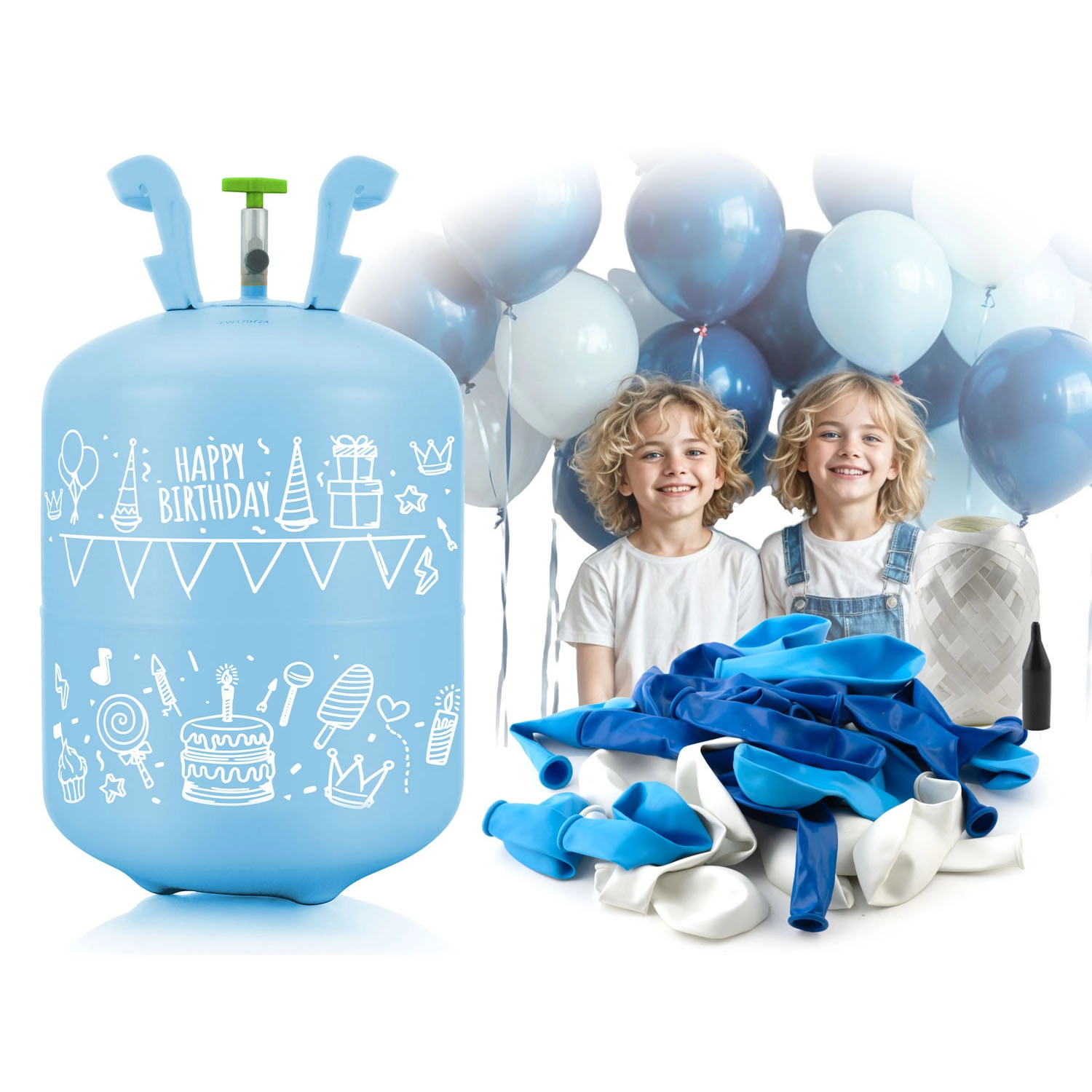 Kompletní párty set pro snadnou výzdobu: heliová láhev 0,20 m³ s minireduktorem, 30 balonků v bílé a modrých odstínech a 40 m dekorační stuhy. Jednorázová, přenosná láhev splňuje normy EN71 a CE a vystačí přibližně na 30 balonků o průměru ~23 cm – ideální na narozeniny, svatby, baby shower i dětské oslavy.