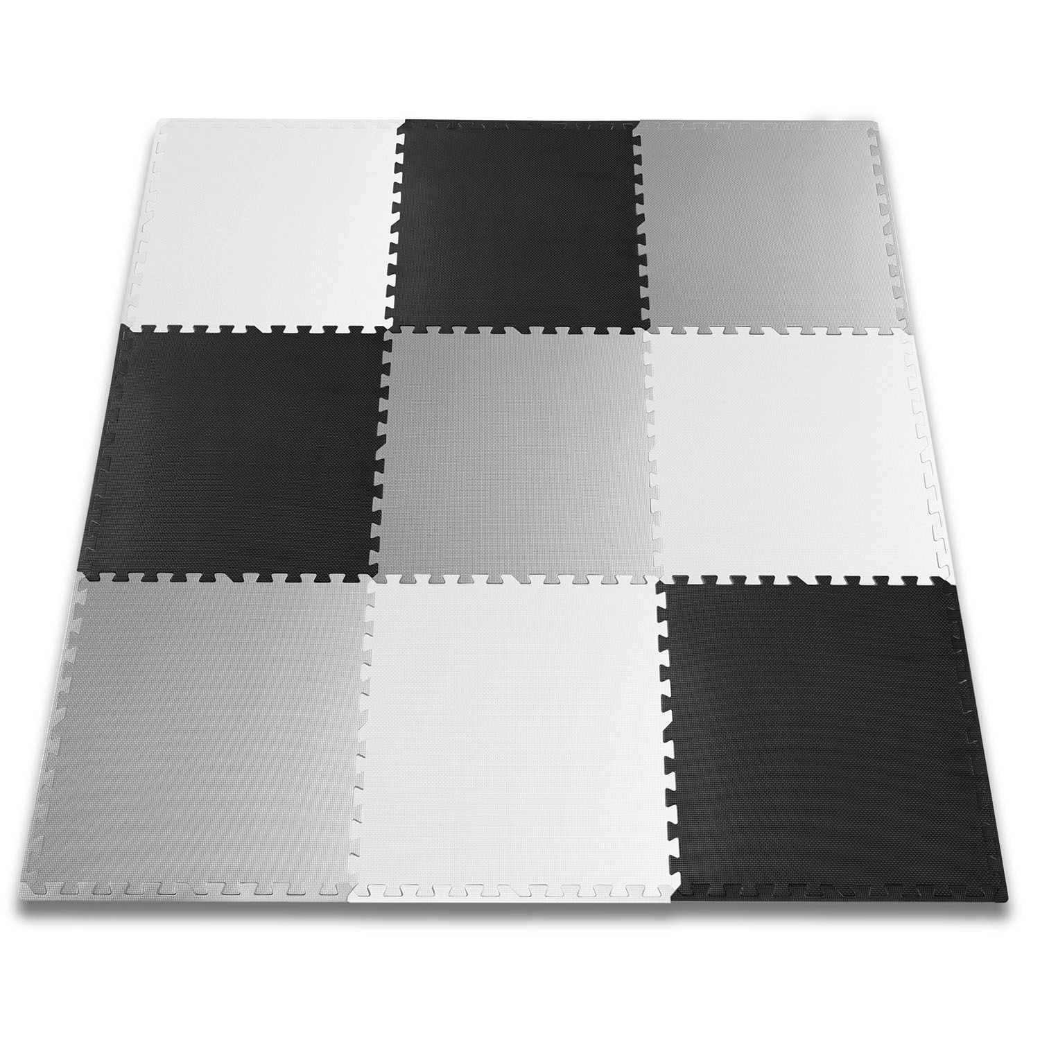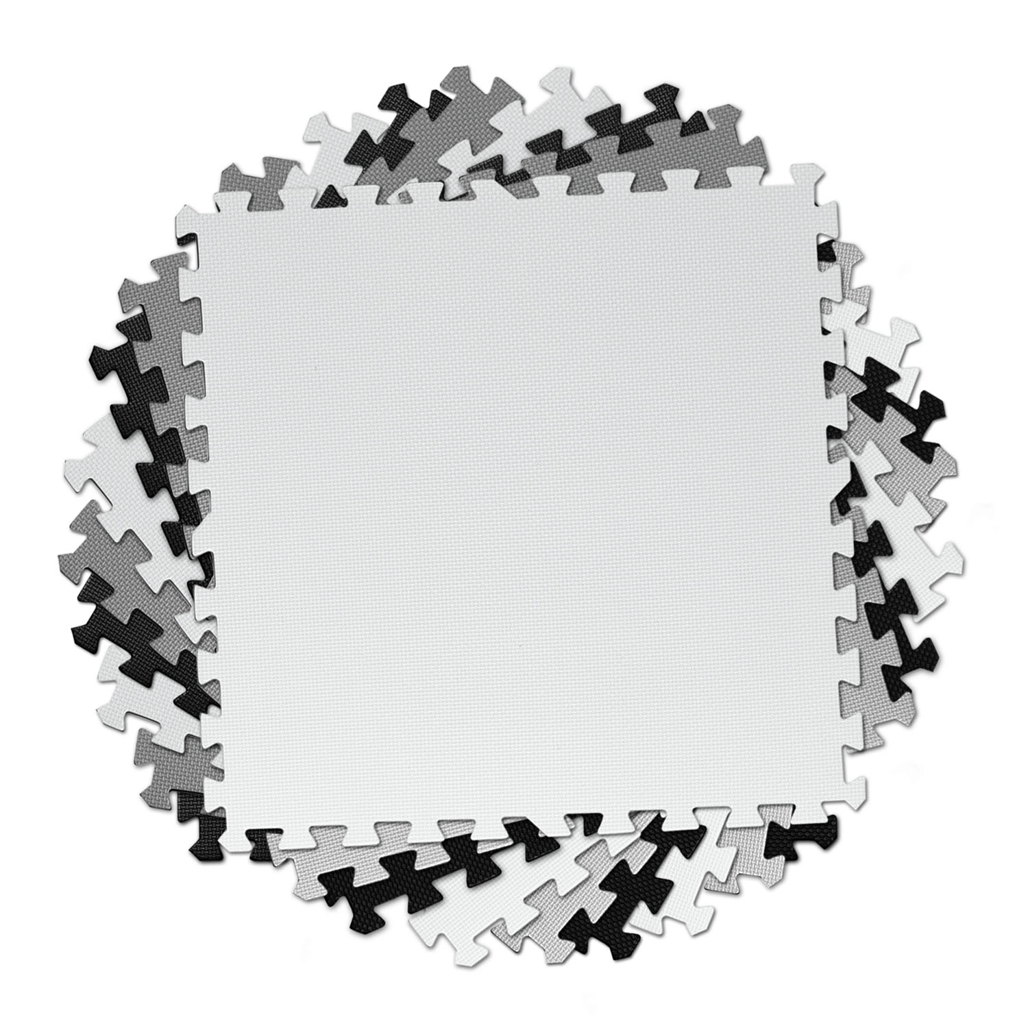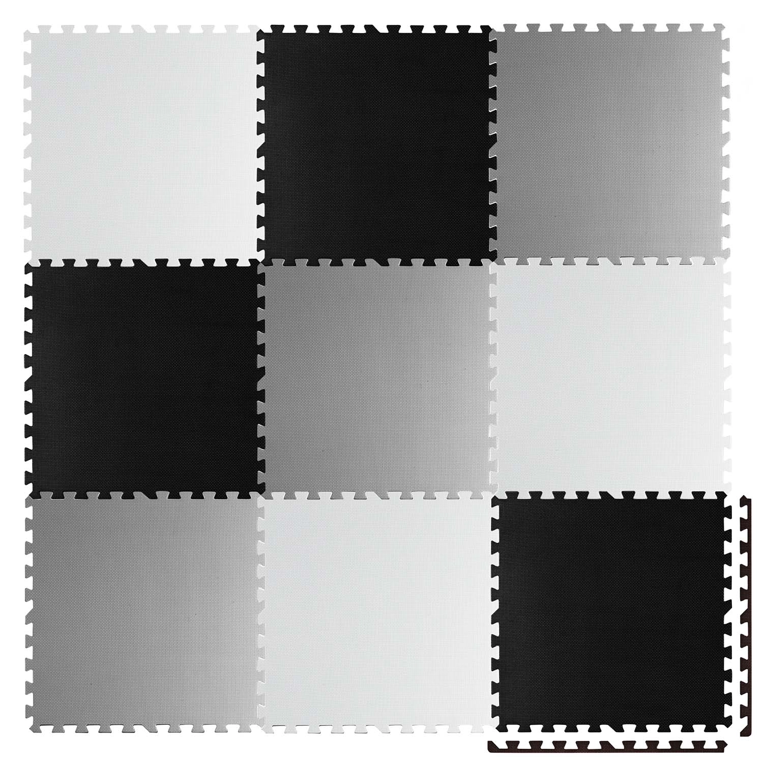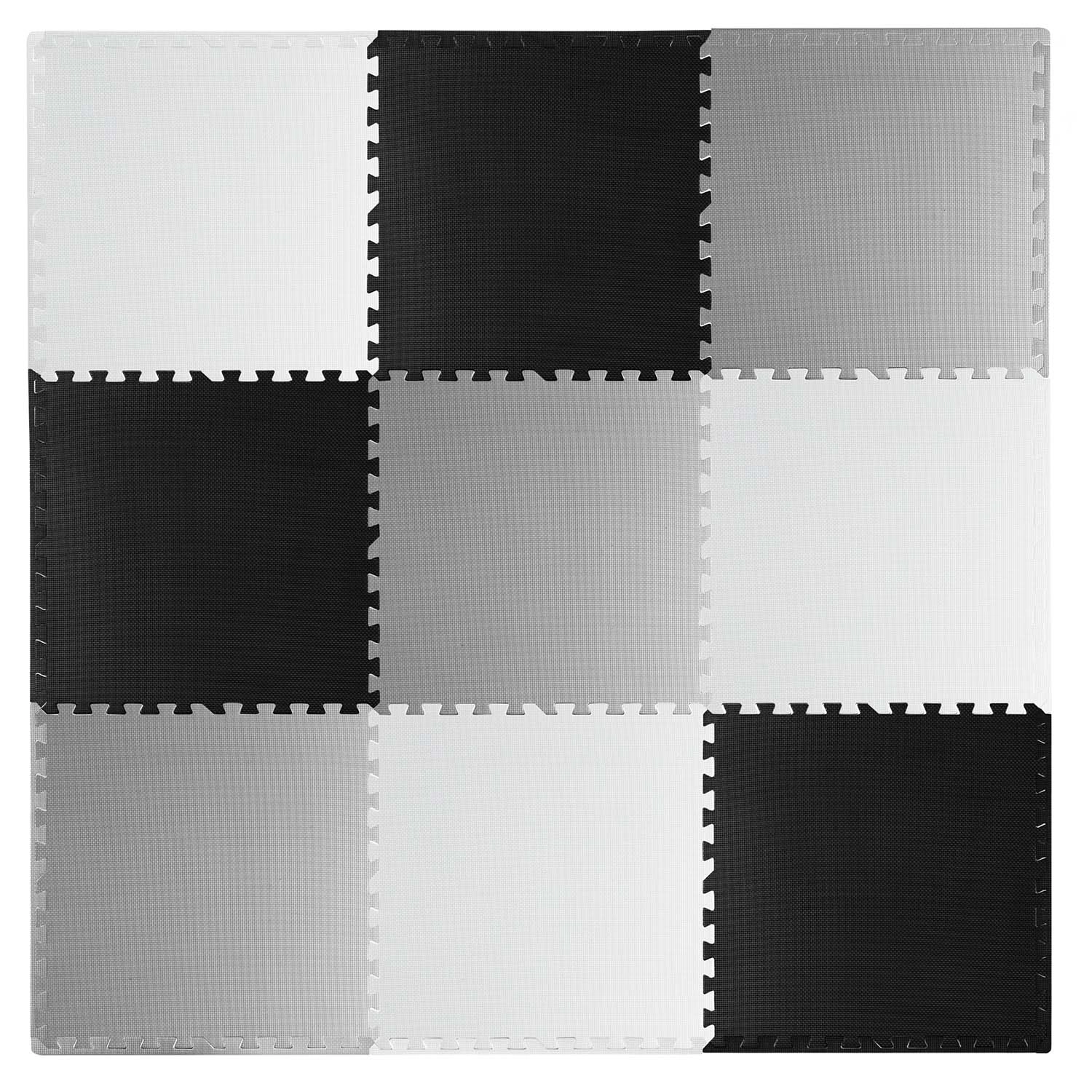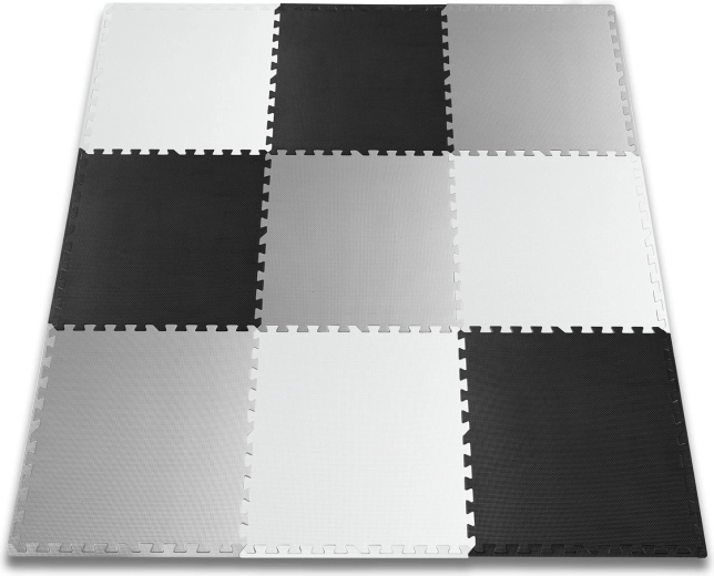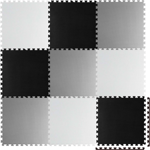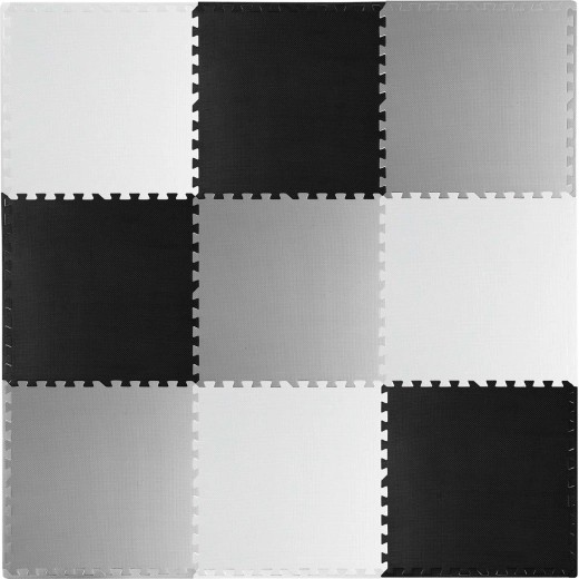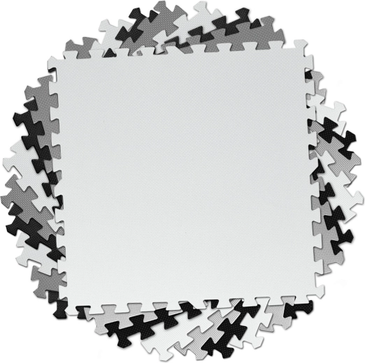 Devět velkých dílů 60 × 60 cm se skládá jako puzzle – jednoduše je spojíte do šachovnicového vzoru, sestavíte menší rohože, nebo vytvoříte 3D tvary. Protiskluzová textura drží stabilně na místě a zvyšuje bezpečí při hře. Nezadržuje prach ani roztoče, proto je vhodná i pro alergiky a pro děti od 0+ měsíců.
