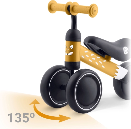 Omezený a bezpečný úhel natočení řídítek brání náhlému přetočení a pomáhá udržet směr. Široká plastová kola s průměrem 15 cm zajišťují stabilitu v interiéru i venku, měkké pěnové sedlo a gumové rukojeti se stopery zvyšují komfort i bezpečí.