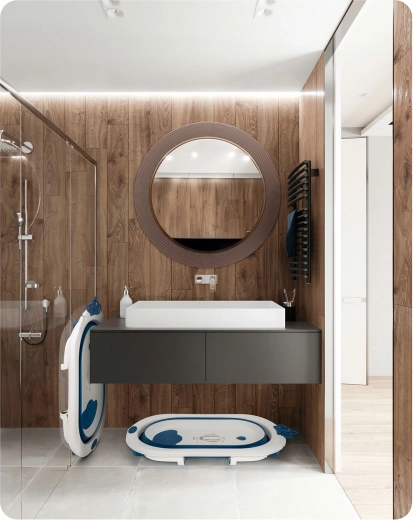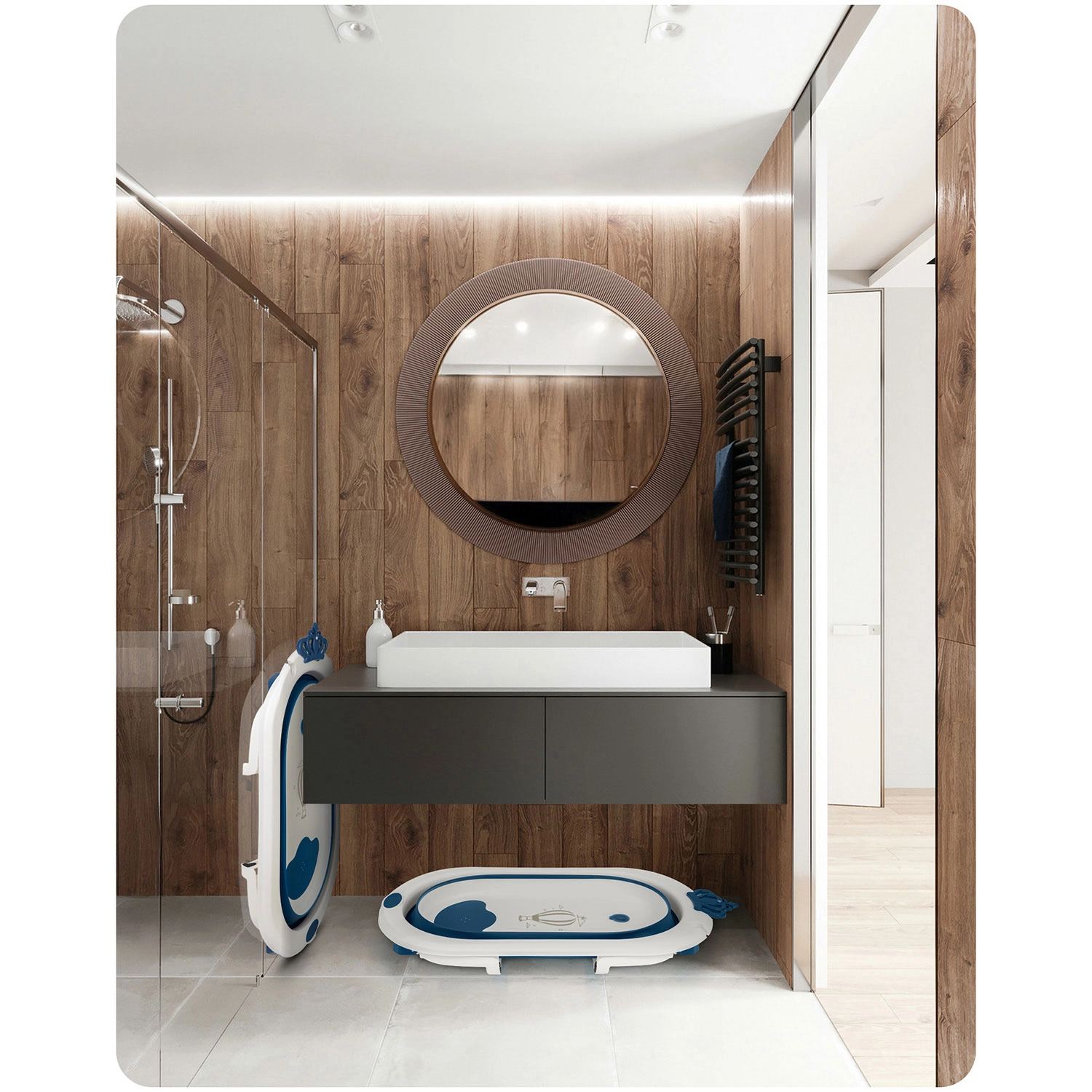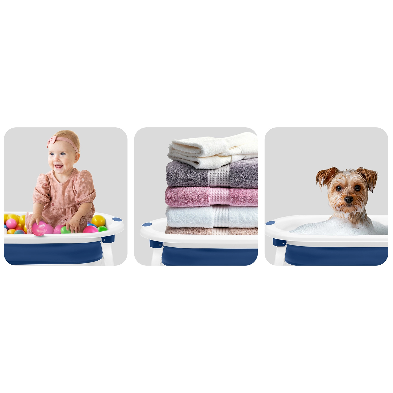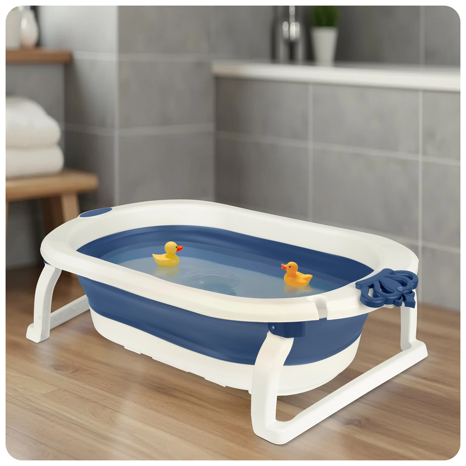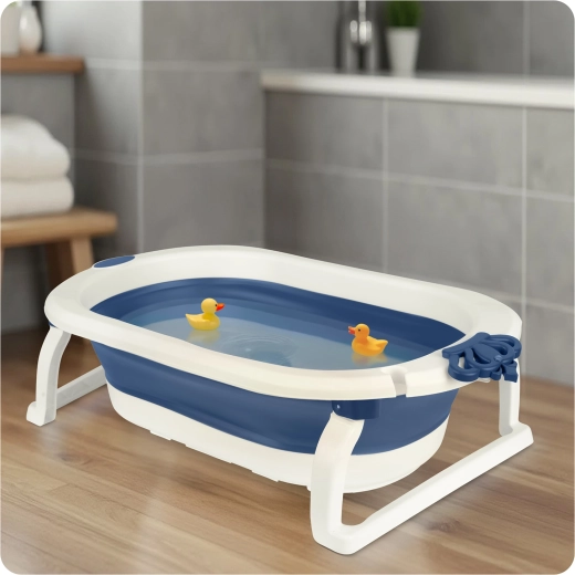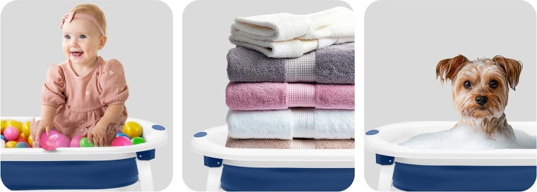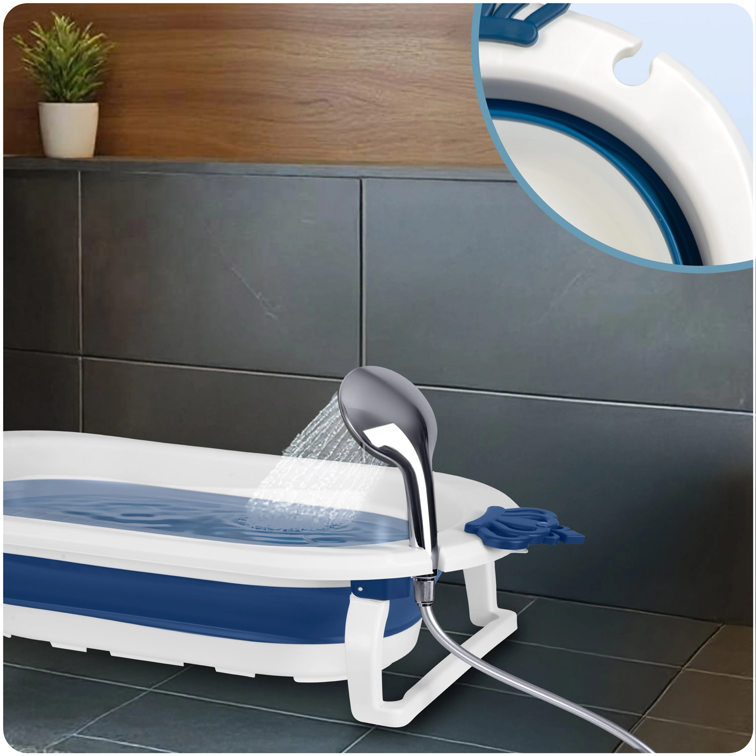Kompaktní rozměry po složení šetří místo v koupelně i při cestování. Integrovaný držák na sprchovou hlavici usnadňuje napouštění vody bez rozstřiku.