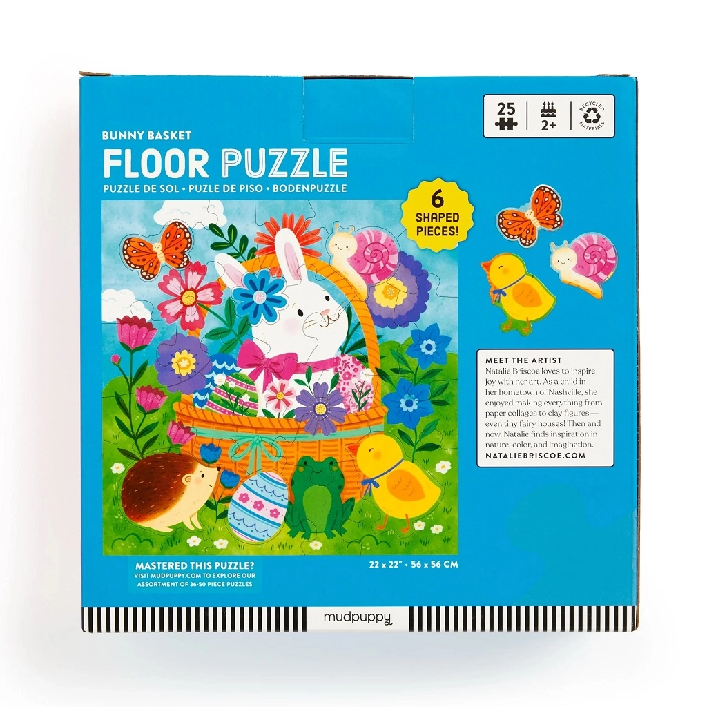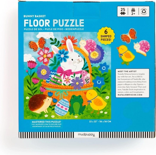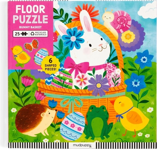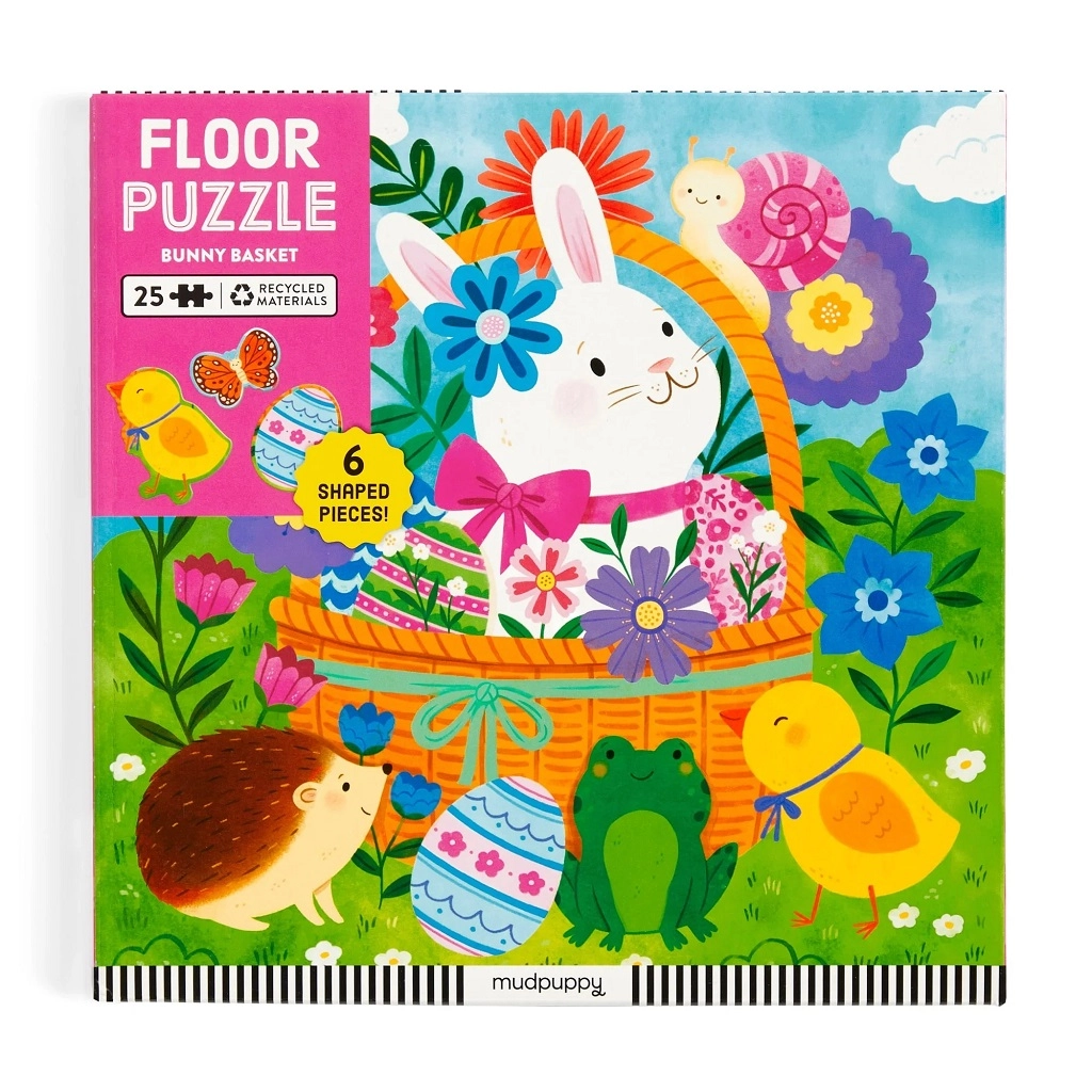 Užijte si jarní skládání s podlahovým puzzle Mudpuppy Velikonoční zajíček! Obsahuje 25 velkých dílků včetně 6 tvarovaných kusů, které děti snadno uchopí. Puzzle je vyrobené z recyklovaných materiálů, rozvíjí jemnou motoriku a prostorovou představivost a je ideální pro děti od 2 let.