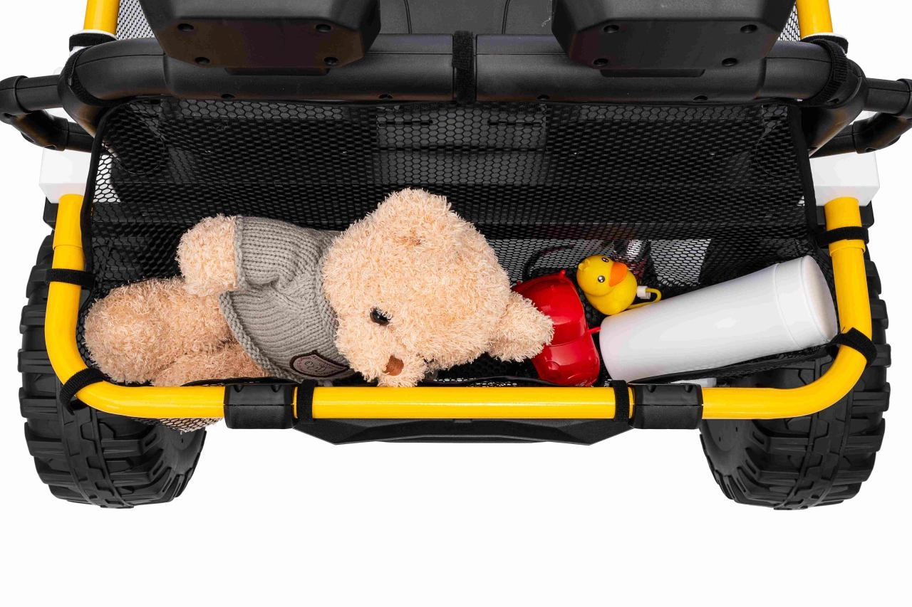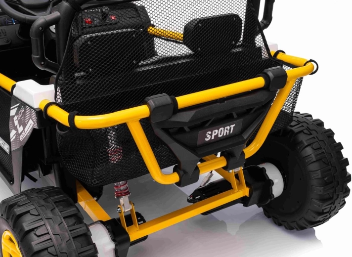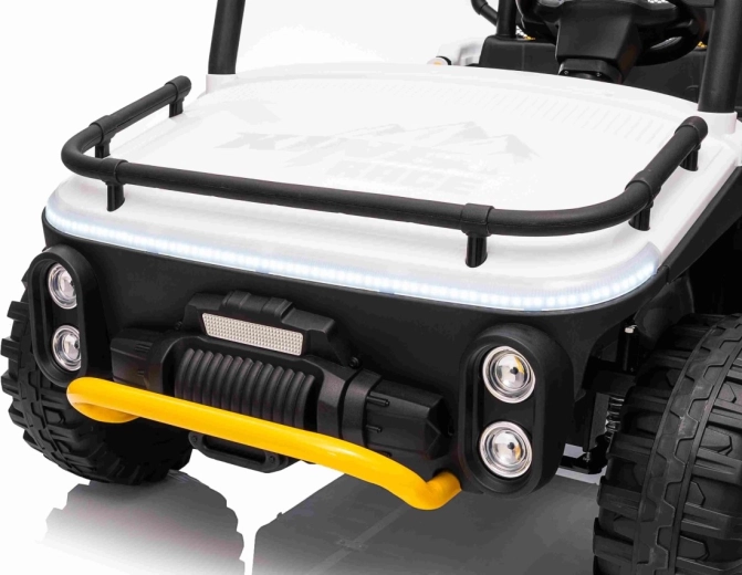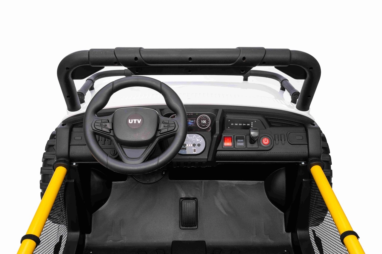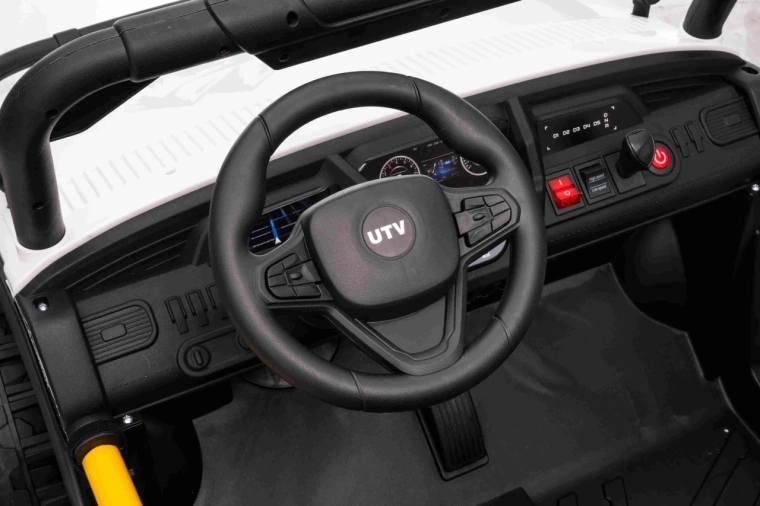 Silné dětské elektrické autíčko ve stylu off-road UTV pro dvě děti nabídne výkonný pohon 2x80 W, baterii 24 V 9 Ah, měkká EVA kola a nezávislé odpružení pro pohodlnou jízdu v terénu. Rodiče ocení dálkové ovládání 2,4 GHz s nouzovým tlačítkem Stop, děti zase LED osvětlení, audio panel s MP3/USB/Bluetooth a dvoumístné sedadlo s pásy.