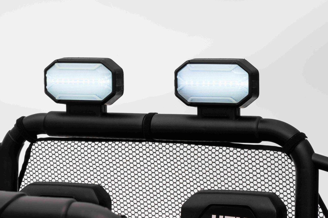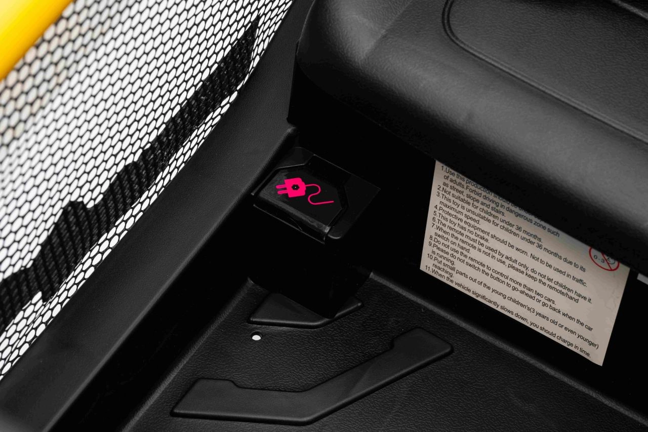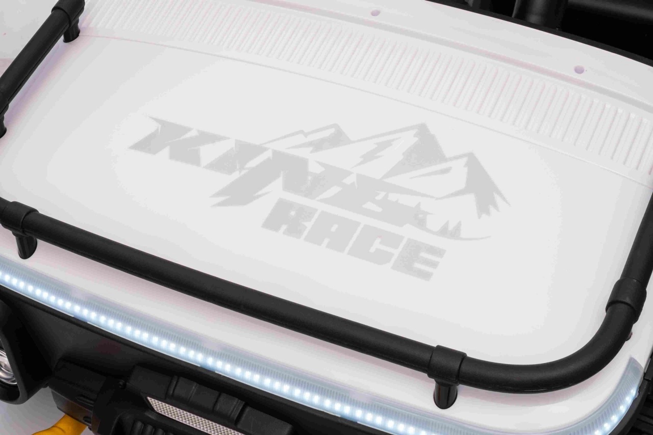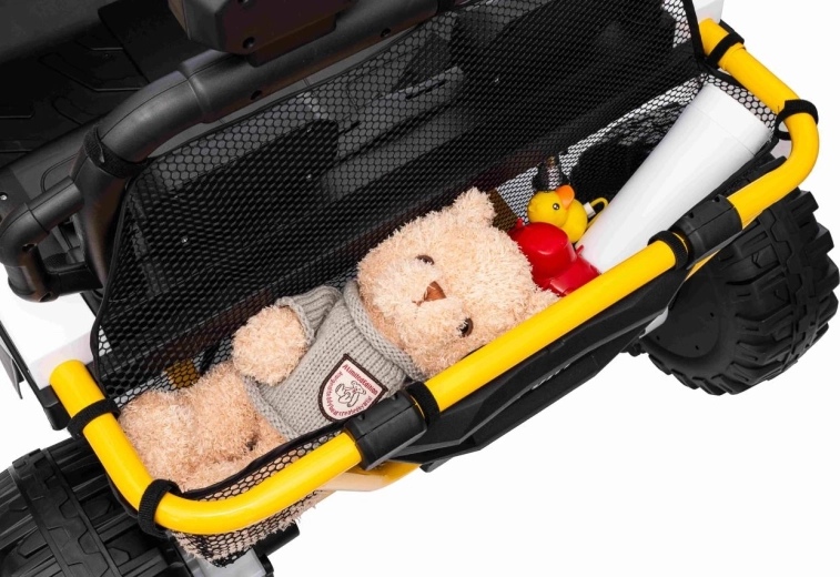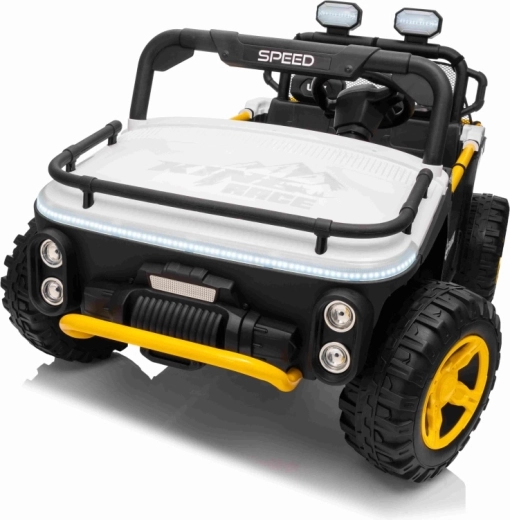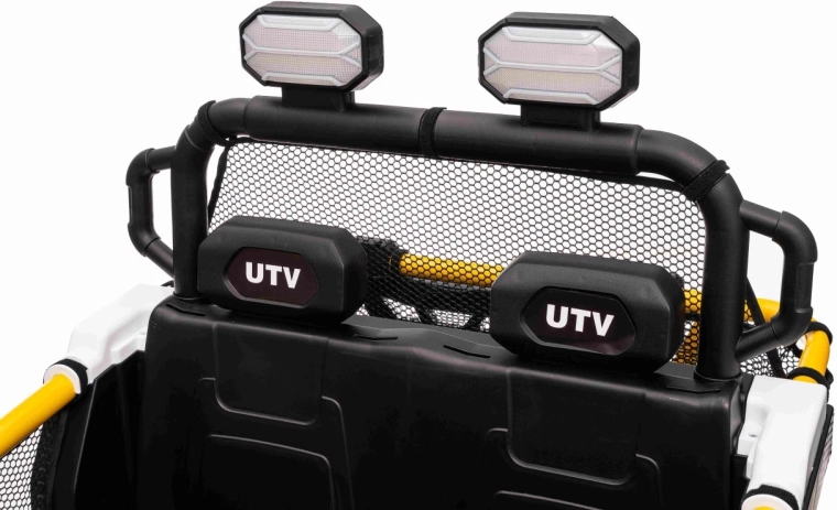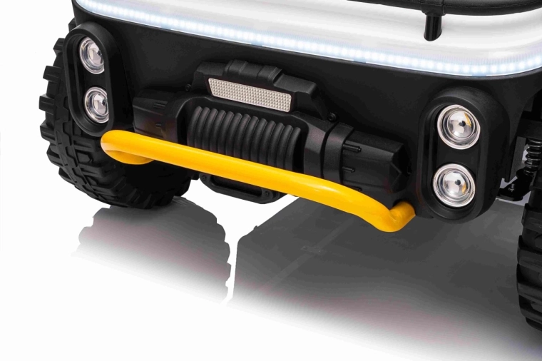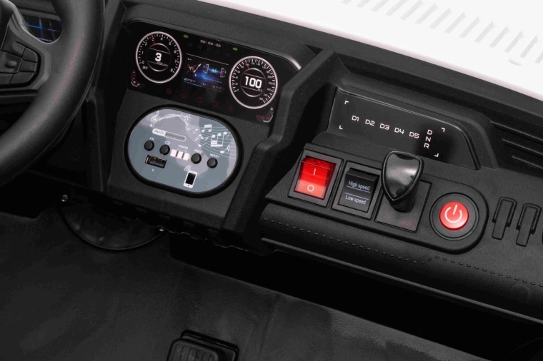 Pro bezpečnost slouží bezpečnostní pásy, vysoké opěrky a rodičovský ovladač 2,4 GHz se třemi rychlostmi a tlačítkem Stop. O skvělou atmosféru se postarají LED světla vpředu i na horním rámu a multimediální panel s MP3/USB/Bluetooth, zvuky a klaksonem.