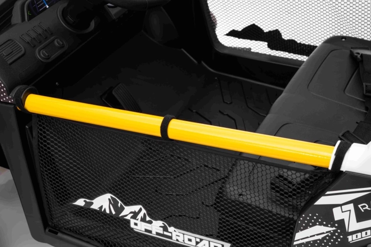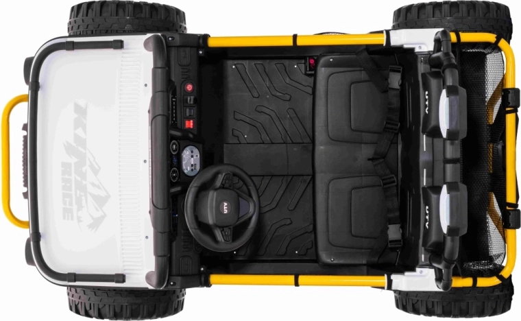 Dálkový ovladač 2,4 GHz se 3 rychlostmi a nouzovým tlačítkem Stop, bezpečnostní pásy a vysoké opěrky chrání posádku při jízdě.