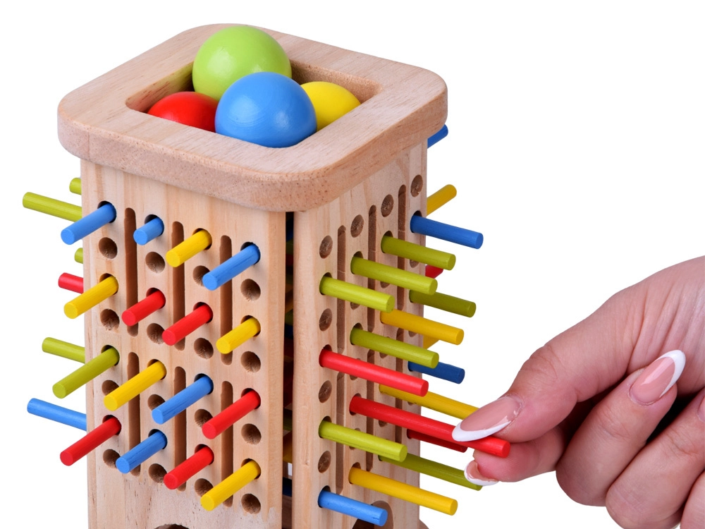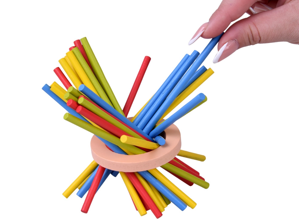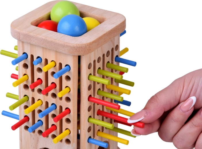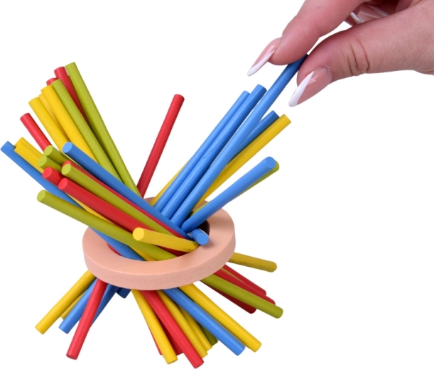 Vytvořte si vlastní varianty: od strategické hry s kuličkami přes jednoduché párování barev pro menší děti až po napínavou zručnostní věž, kde každé vytažení tyčky rozhoduje. Odolné dřevo, hladké hrany a výrazné barvy podporují bezpečnou a atraktivní hru doma i v mateřské škole.