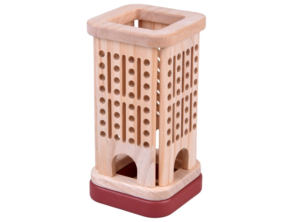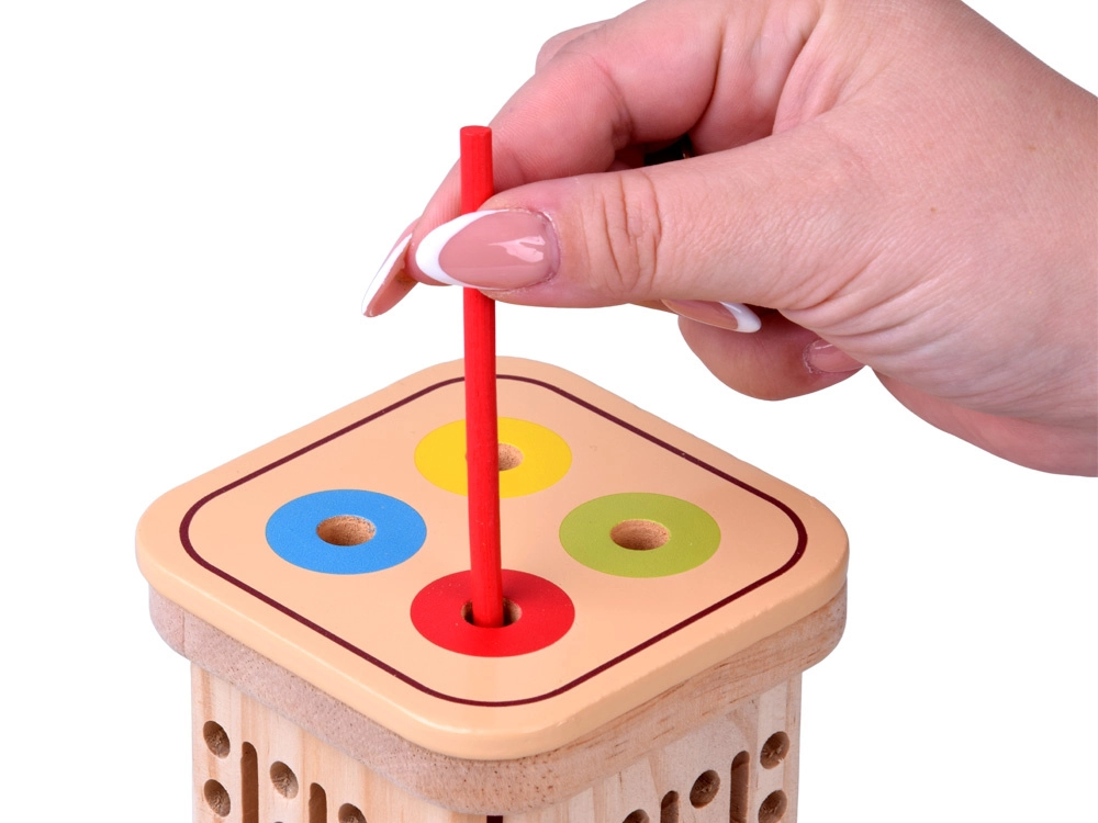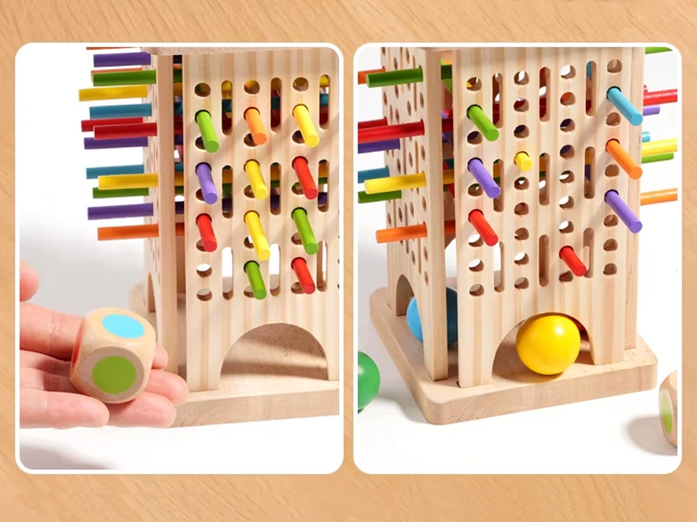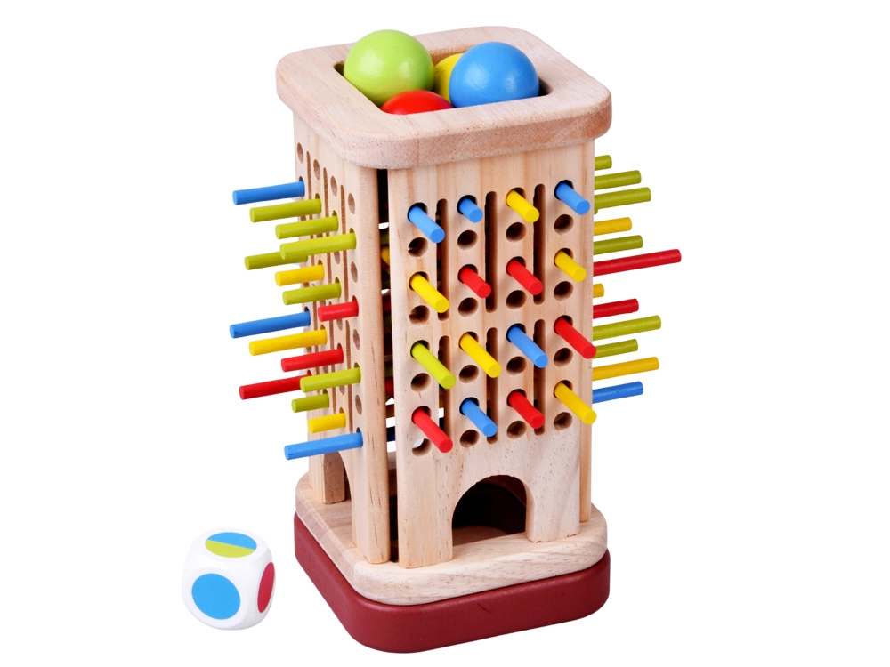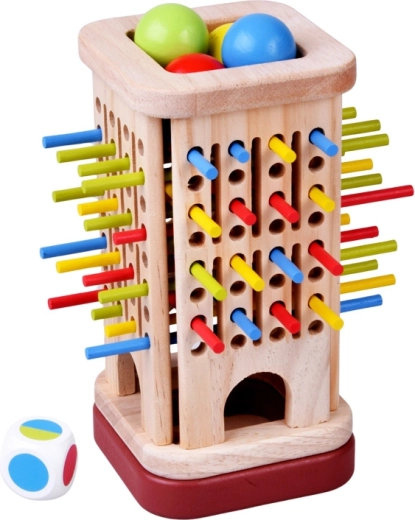 Tato všestranná dřevěná hra spojuje učení s radostí z pohybu. Děti procvičí oči–ruka koordinaci, rozpoznávání barev, trpělivost i plánování kroků. Herní princip je snadno pochopitelný: postavíte konstrukci z tyček, navrch položíte kuličky a podle hodu kostkou opatrně vytahujete tyčky odpovídající barvě.