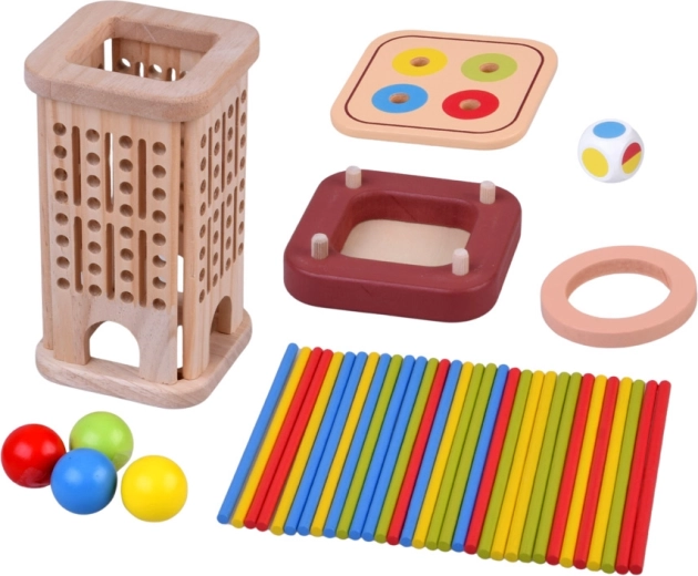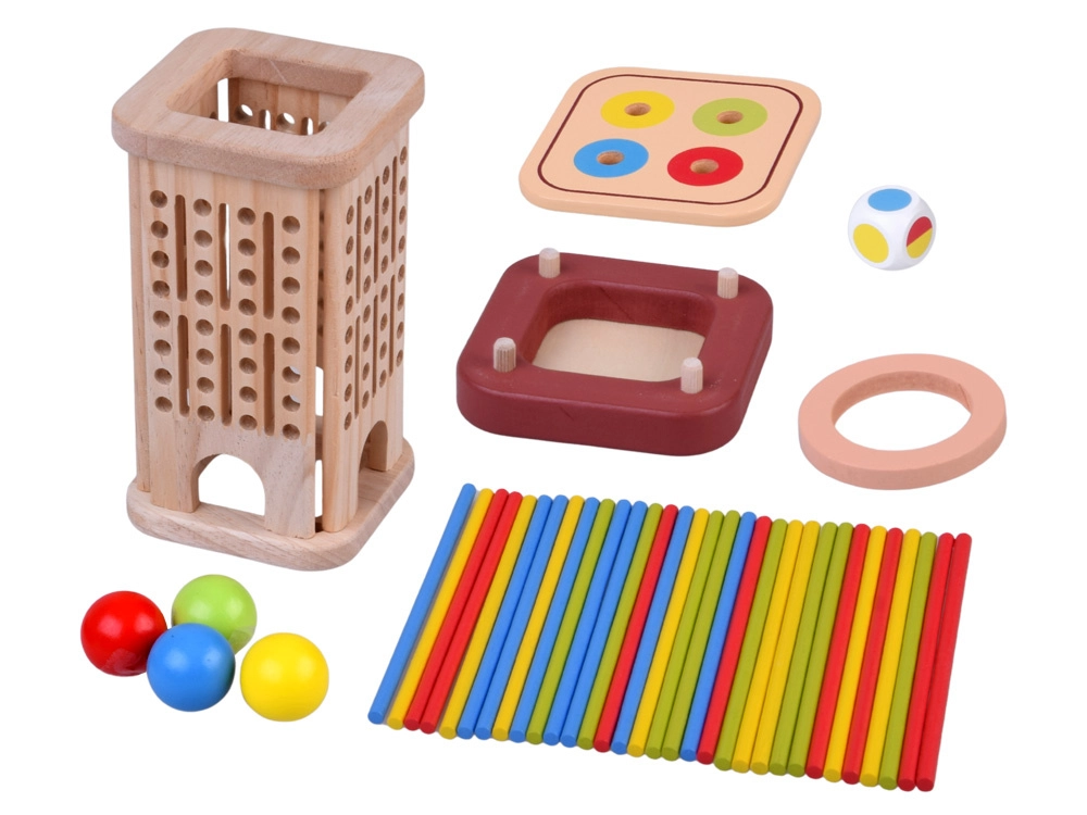 - dřevěná věž, barevná kostka, 36 barevných tyček, 4 kuličky