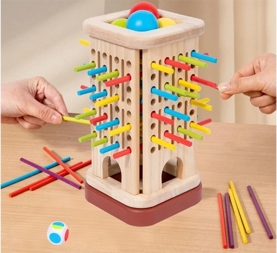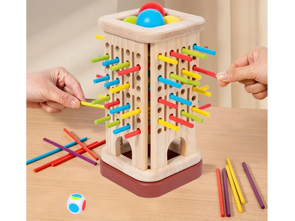 Objevte zábavnou a vzdělávací dřevěnou hru, která trénuje jemnou motoriku, soustředění a logické myšlení. Děti podle hodu barevnou kostkou vytahují tyčky z věže a dávají pozor, aby nespadly kuličky. Stabilní dřevěná věž, jasné barvy a jednoduchá pravidla z ní dělají skvělou společenskou aktivitu pro celou rodinu.