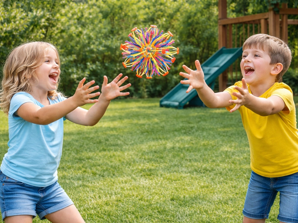 Objevte zábavu s barevnou rozkládací koulí, která se po zatažení plynule zvětšuje a zmenšuje. Tento lehký, flexibilní míček nabízí okamžitý WOW efekt, podporuje smyslovou stimulaci, koordinaci a láká ke společné aktivní hře doma i venku.