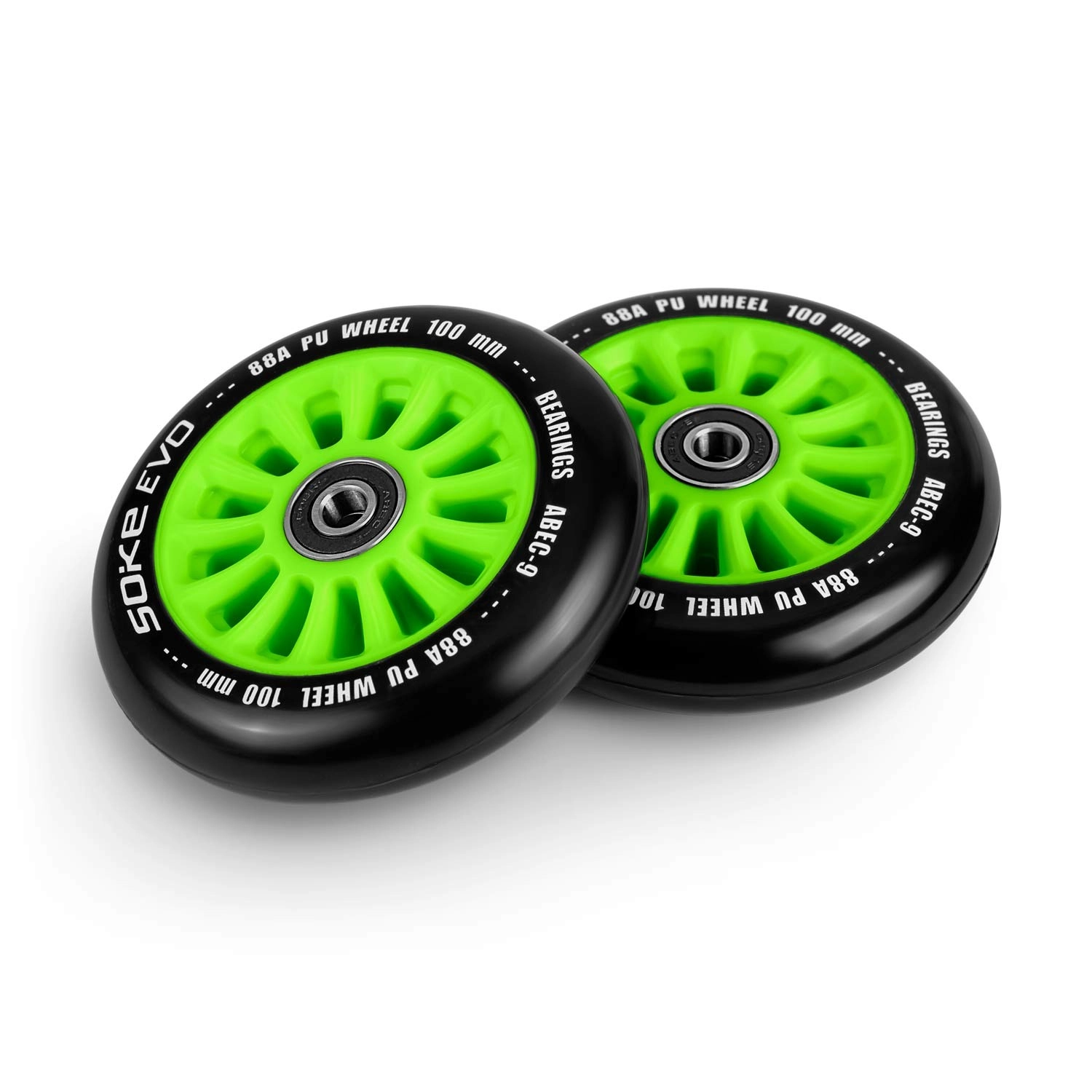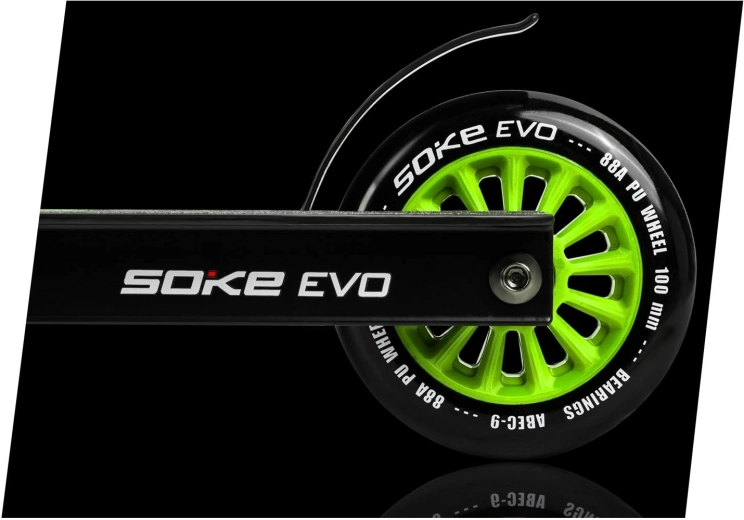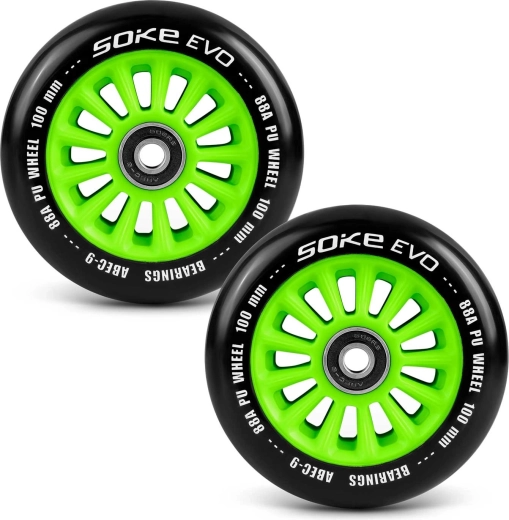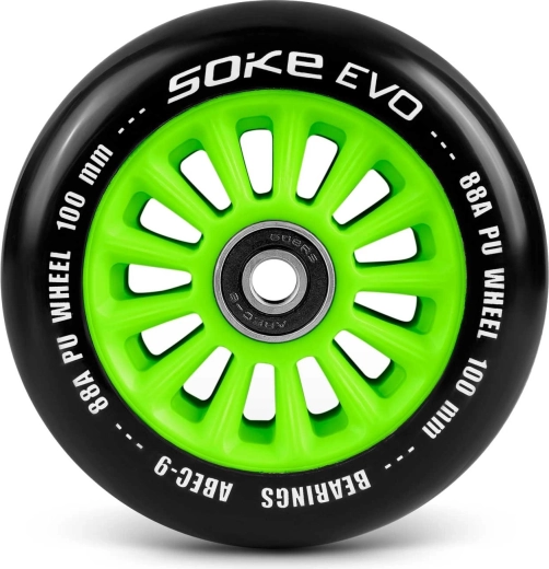 Kolečka SOKE 100 mm jsou navržena pro jezdce, kteří chtějí vyšší rychlost, stabilitu a spolehlivost při každodenní jízdě i nácviku triků. Polyuretanová směs s tvrdostí 88A zajišťuje jistý grip a nízký valivý odpor, zatímco ložiska ABEC-9 dodají koloběžce svižnou akceleraci a plynulé rozjíždění.