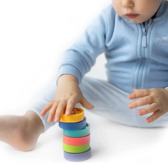 Snadno uchopitelné disky děti skládají do věže, přendávají a mačkají – tím trénují úchop, koordinaci ruka–oko a přesnost pohybů.