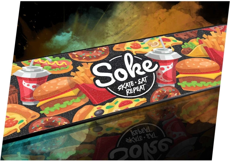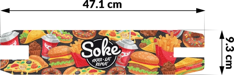 Vylepšete kontrolu nad svou koloběžkou s grip tapem SOKE Go! – Fast Food. Hrubší zrnitost nabízí pevný a stabilní kontakt mezi botou a deskou, takže se můžete naplno soustředit na učení nových triků i na pokročilé kombinace. Stylový potisk dodá vaší desce originální vzhled a odliší vás v parku i na ulici.