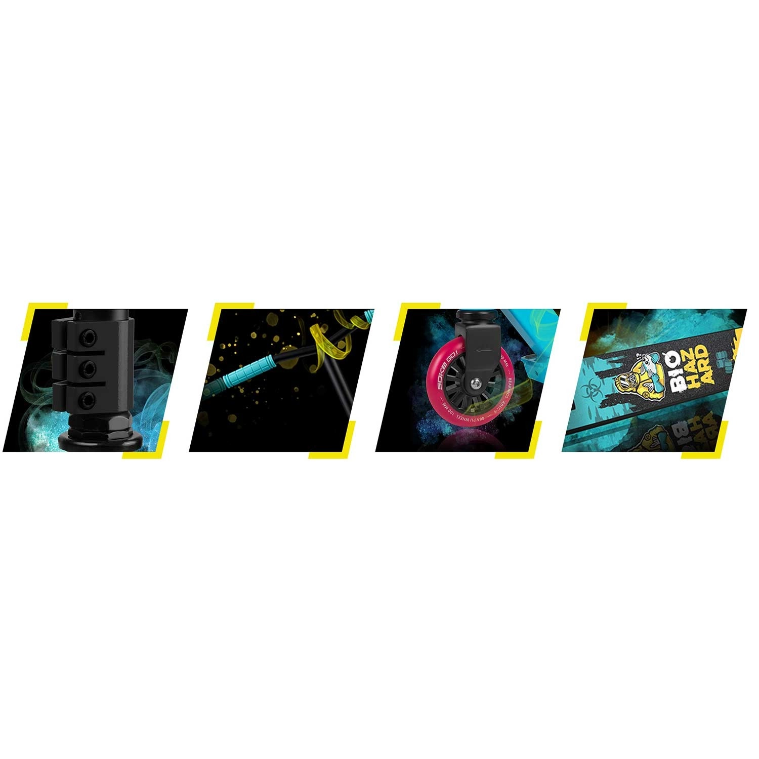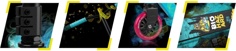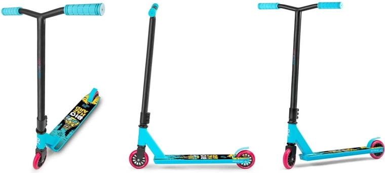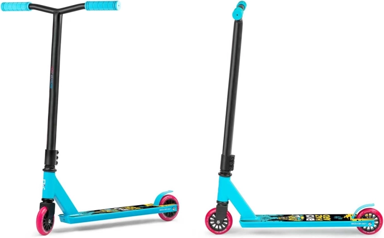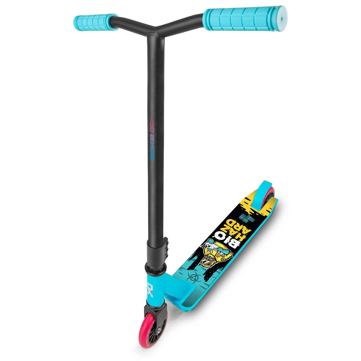 Model SOKE GO! v tyrkysové barvě je navržen pro jistotu při tricích, rychlou akceleraci a dlouhou životnost. Široká Y řídítka s pohodlnými TPR gripy 145 mm dávají výbornou stabilitu, zatímco tuhá hliníková trojitá objímka drží vše pevně pohromadě. Nízká hmotnost 2,9 kg pomáhá při whipech i spinech.