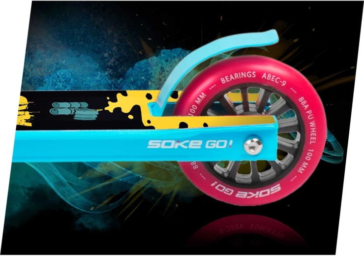 Pro kontrolované brzdění je tu Flex Fender z oceli a kompletní osazení splňuje normu EN 14619. Koloběžka je určena do skateparku, ale nezalekne se ani městských překážek. V balení navíc dostanete značkové samolepky a černý náramek SOKE, vše v pevném, ekologickém balení.