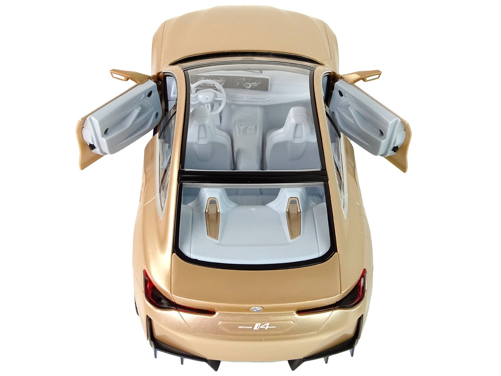 Detailní karoserie BMW i4 s panoramatickou střechou, precizními liniemi a lesklým zlatým lakem v měřítku 1:14 vypadá skvěle na trati i ve vitríně.