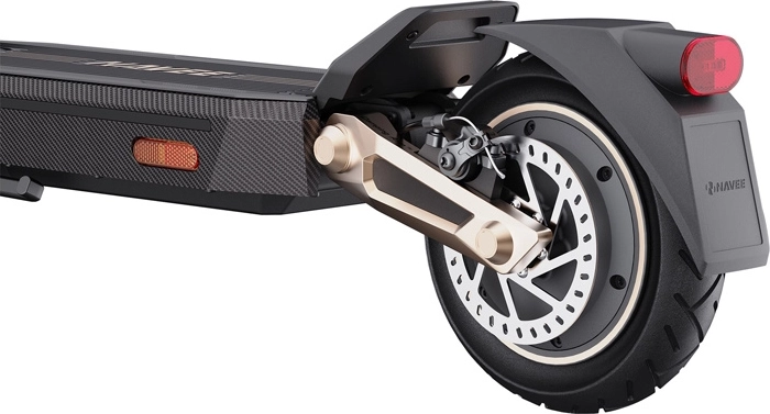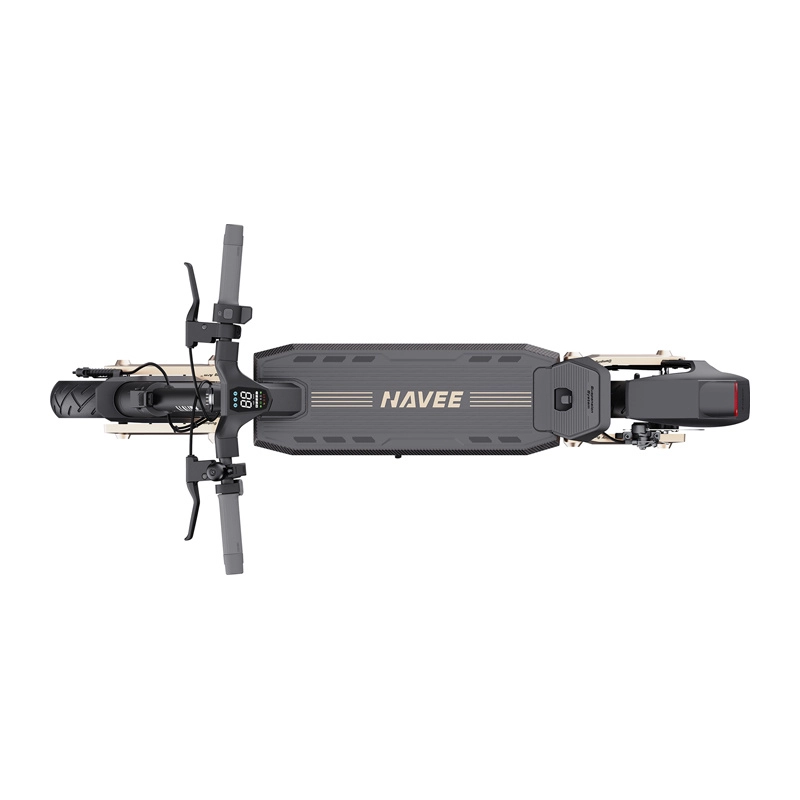 Bezdušové 10" samopravitelné pneumatiky s gelovou vrstvou odolají průrazům do cca 4 mm. Široká řídítka se sklonem 5° zlepšují ergonomii, rozšířená nášlapná plocha zvyšuje stabilitu. Chytré funkce zahrnují Apple Find My, odemykání přiblížením, ambientní osvětlení s 15 režimy a ovládání přes aplikaci NAVEE.