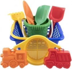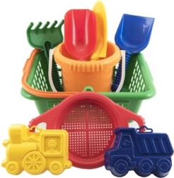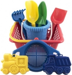 Hravá dětská sada na písek s praktickým košíkem obsahuje vše potřebné pro zábavu na pláži i pískovišti: kyblík, lopatku, rýč, hrabičky, sítko a 2 bábovky. Lehký odolný plast je vhodný pro děti od 12 měsíců a podporuje jemnou motoriku a fantazii.