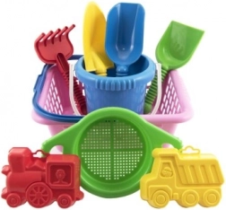 V balení najdete kyblík, lopatku, rýč, hrabičky, sítko a 2 bábovky. Děti mohou rýt, prosévat, nabírat i tvořit tvary a naplno rozvíjet kreativitu při hře v písku.