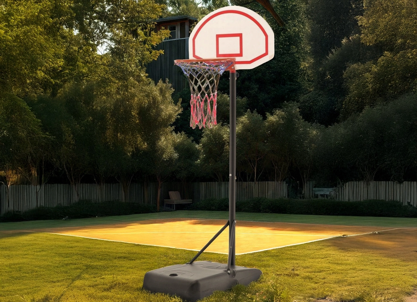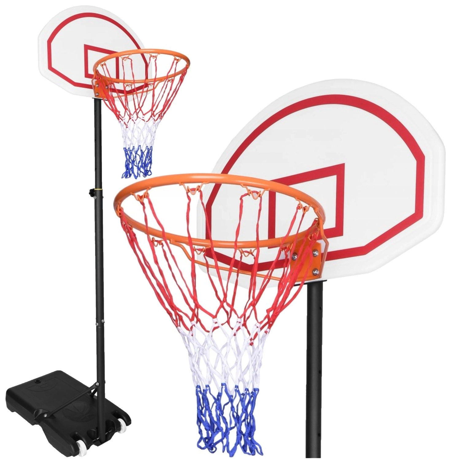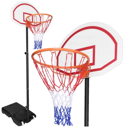 Výšku koše snadno přizpůsobíte od 165 do 205 cm, takže se hodí pro různé věkové kategorie i úrovně dovedností. Podstavec s možností plnění vodou nebo pískem dodá stabilitu, zatímco transportní kolečka umožní koš rychle přesunout tam, kde zrovna hrajete.
