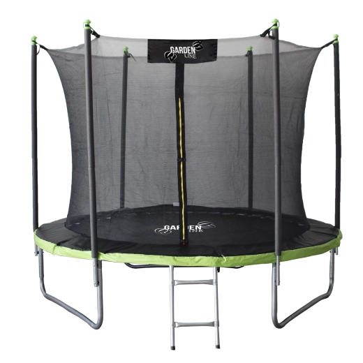 Bezpečí zajišťuje síť o výšce 180 cm se zipem a přezkou, polstrované sloupky a 54 pružin pro dynamické, ale kontrolované odrazy. Žebřík zajišťuje snadný a bezpečný přístup, zatímco U nohy poskytují stabilitu na zahradním povrchu.