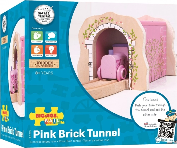 Růžový železniční tunel BIGJIGS RAIL je stylový doplněk, který dodá vaší dřevěné vláčkodráze barvy a nové herní možnosti. Díky pevné konstrukci a hladkým hranám je bezpečný pro malé ruce a připravený na každodenní hraní.