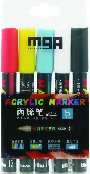 Balení obsahuje 5 rozdílných barev, které jsou ideální pro rozmanité výtvarné techniky. Můžete se spolehnout na rychloschnoucí vlastnosti a voděodolnost po zaschnutí. To vše ve praktické krabičce o rozměrech 9 x 18 x 2 cm.