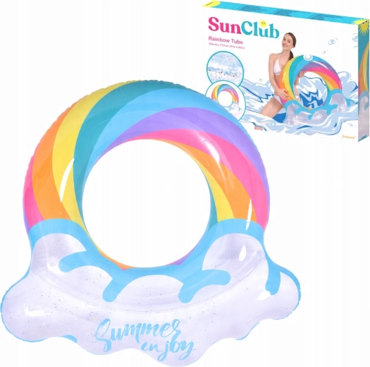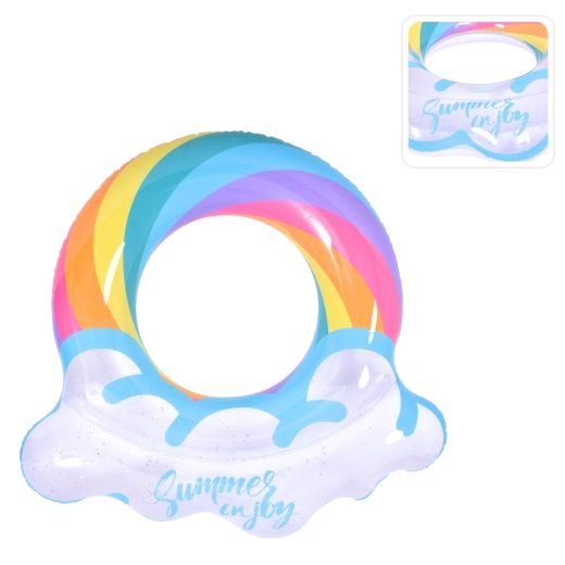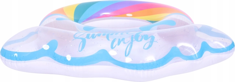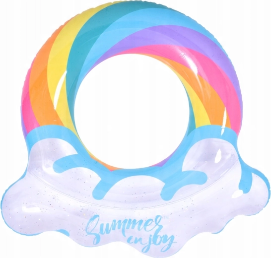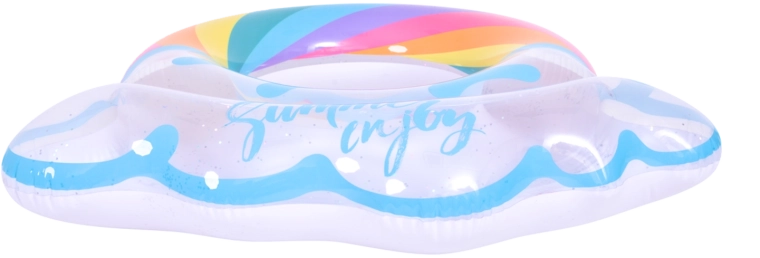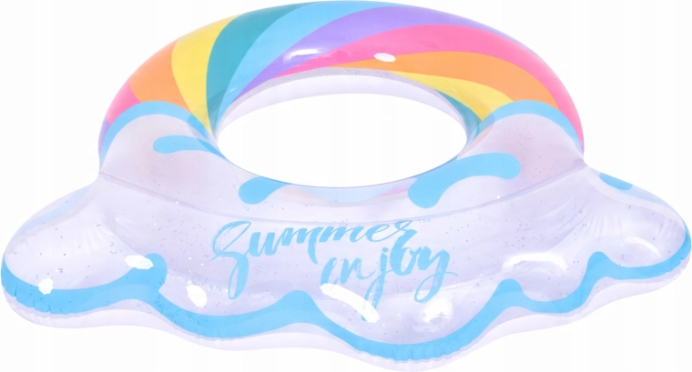 Nafukovací kruh s motivem duhy a obláčkovými okraji je perfektním společníkem pro letní zábavu. Průhledné tělo s barevnými pruhy a třpytivými částicemi zajišťuje výbornou viditelnost na vodě a zároveň vynikne na každé fotce. Díky pevné vinylové konstrukci je kruh odolný proti oděru a běžnému opotřebení.