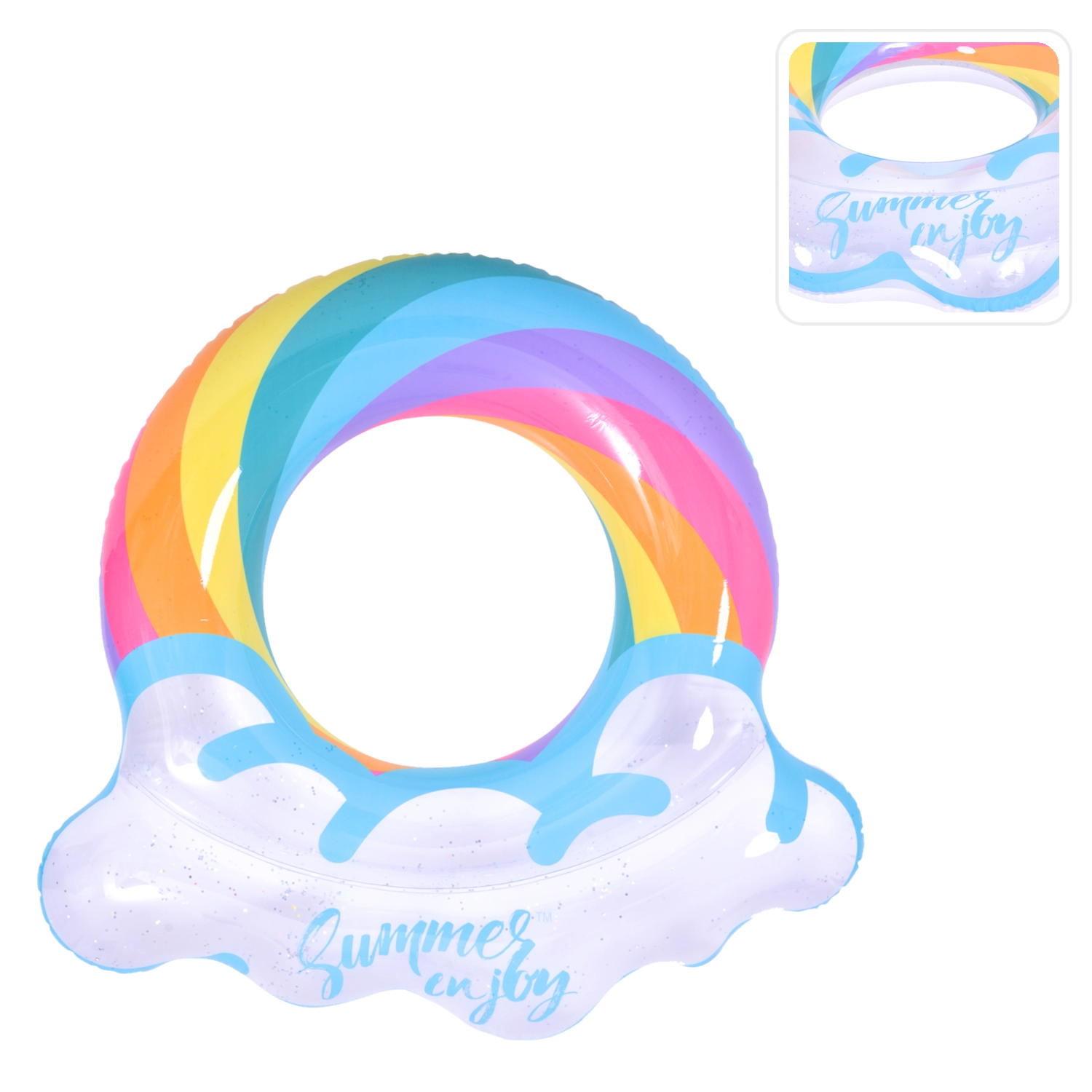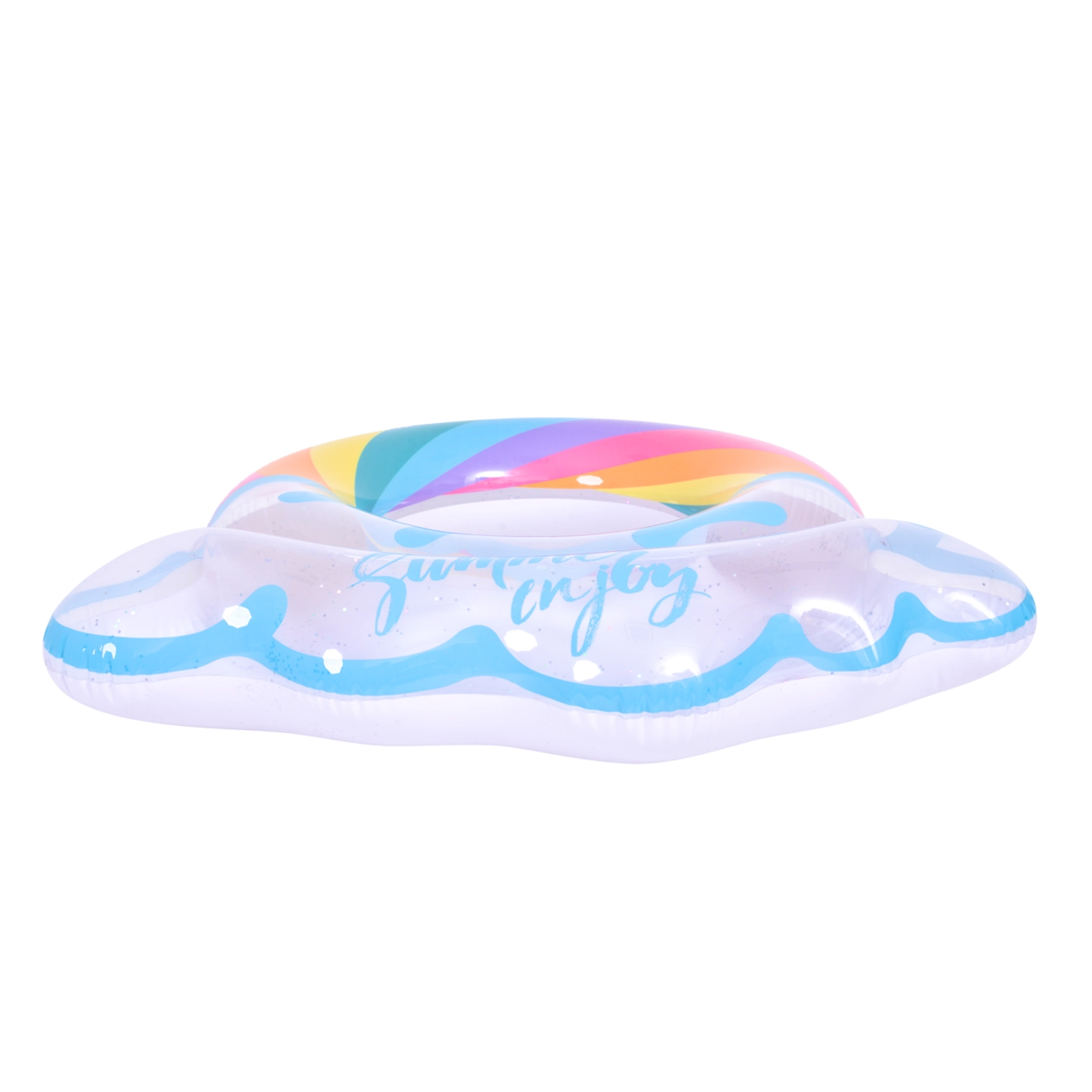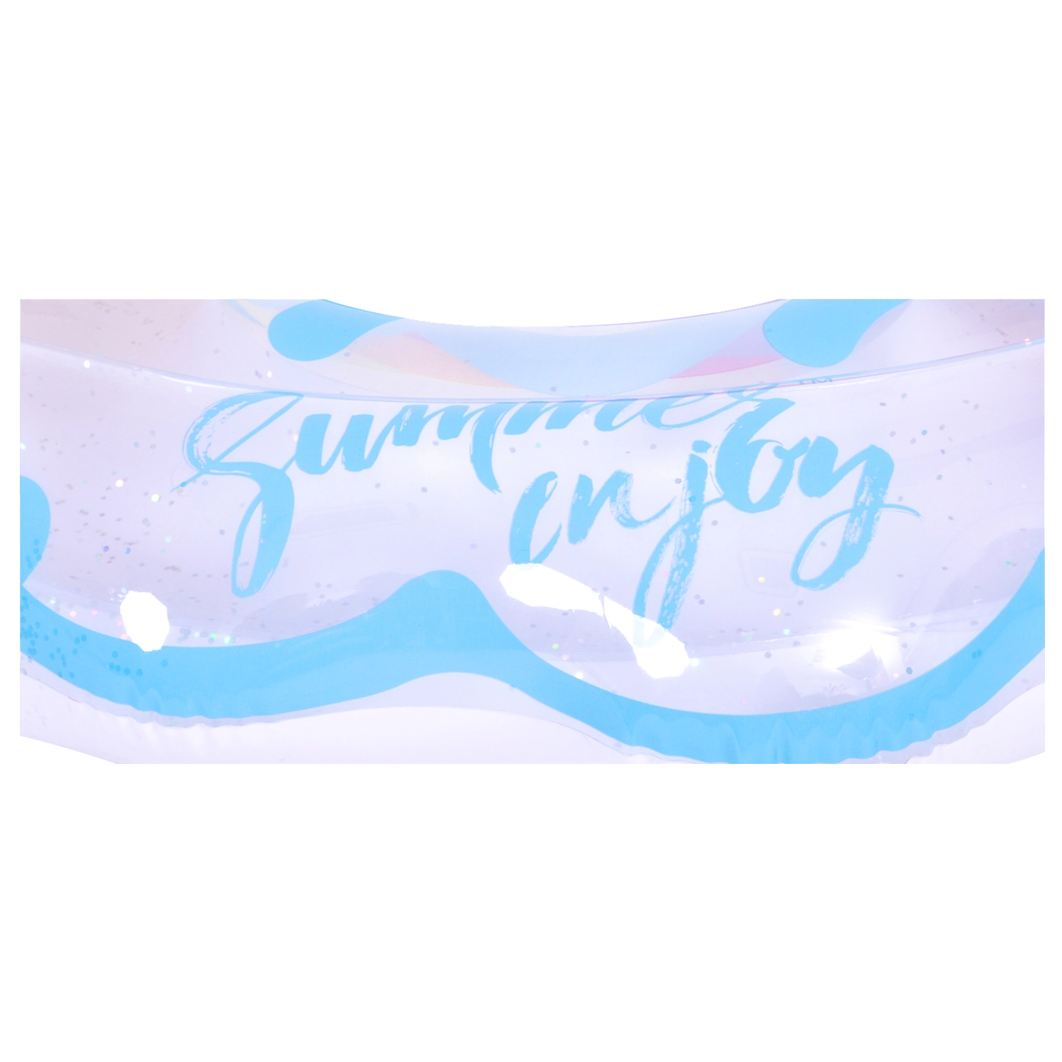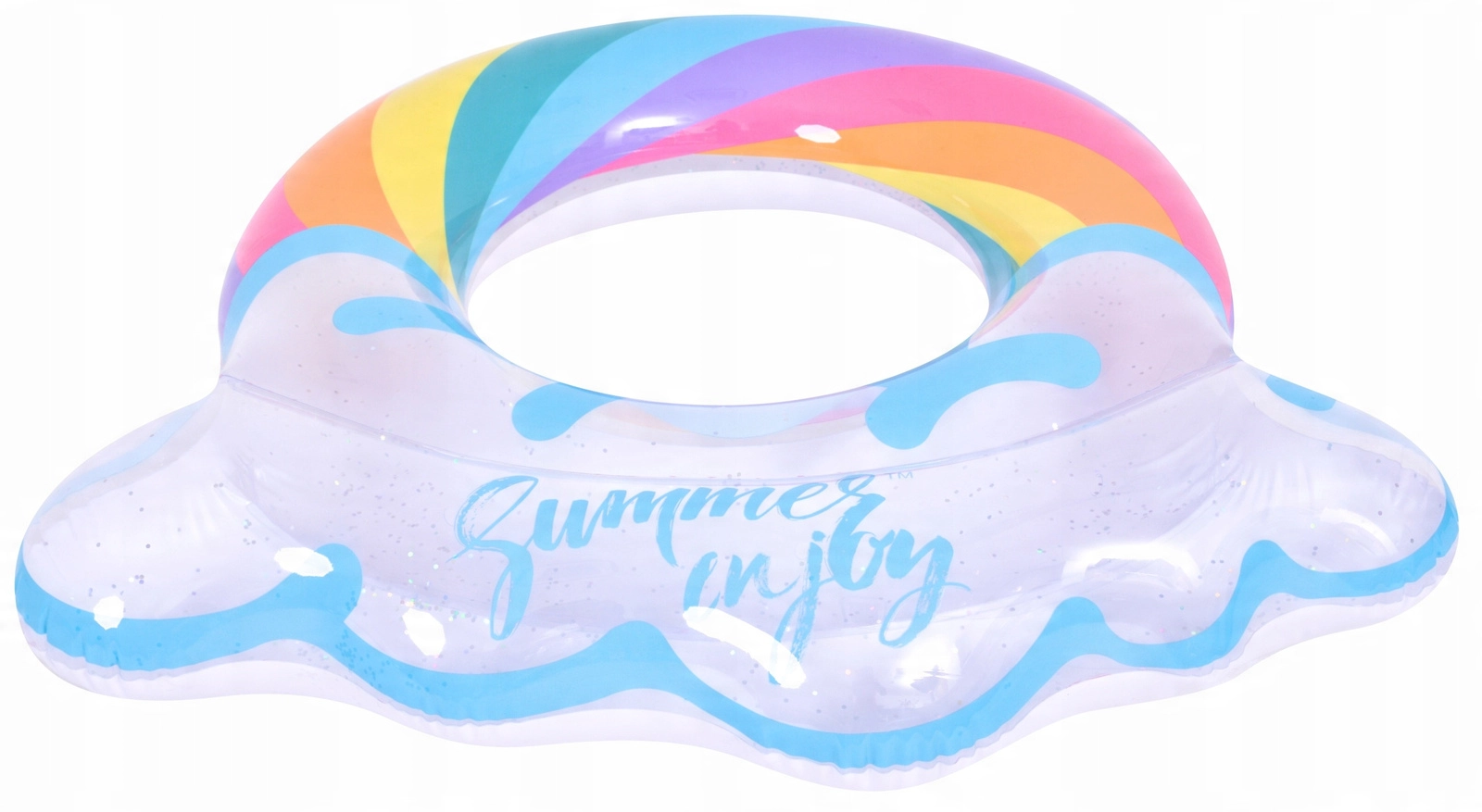 Užijte si léto naplno s tímto stylovým nafukovacím kruhem ve tvaru duhy. Průhledný design s modrými akcenty a lesklými třpytkami dodává vodním radovánkám šmrnc. Ideální do bazénu i k moři, vyrobeno z odolného vinylu pro dlouhou životnost a bezpečné plavání a relaxaci. Velký průměr 106,5 × 103 cm zajistí pohodlí pro teenagery i dospělé 12+.